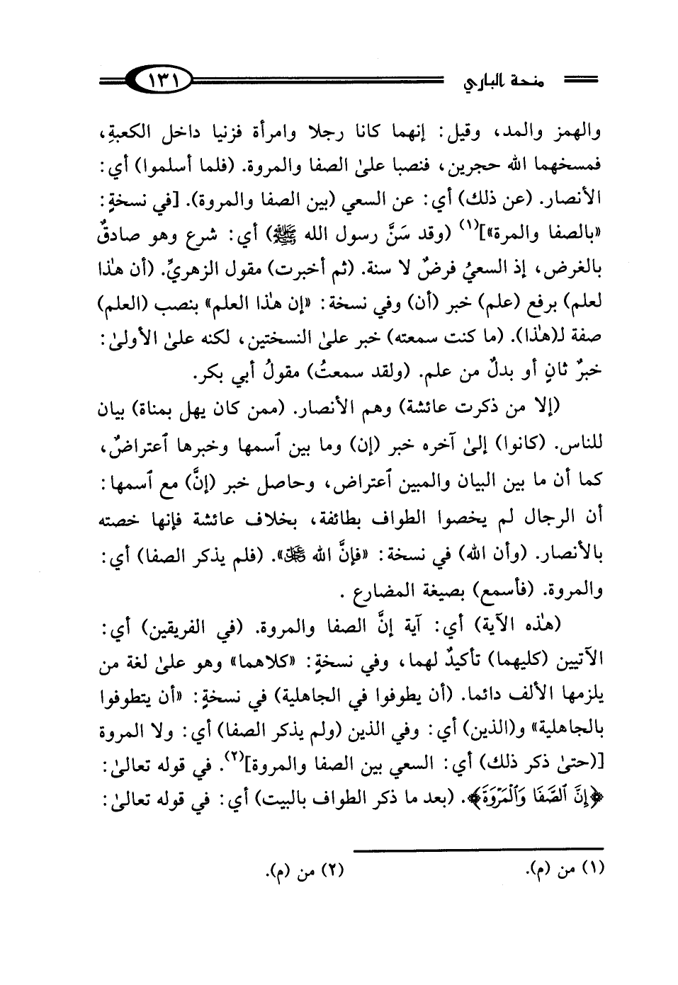 (هذه الآية) أي: آية إن الصفا والمروة. (في الفريقين) أي: الآتيين (كليهما) تأكيدٌ لهما، وفي نسخةٍ: "كلاهما" وهو على لغة من يلزمها الألف دائما. (أن يطوفوا في الجاهلية) في نسخةٍ: "أن يتطوفوا بالجاهلية" و (الذين) أي: وفي الذين (ولم يذكر الصفا) أي: ولا المروة [(حتى ذكر ذلك) أي: السعي بين الصفا والمروة] (¬2). في قوله تعالى: {إِنَّ الصَّفَا وَالْمَرْوَةَ}. (بعد ما ذكر الطواف بالبيت) أي: في قوله تعالى: