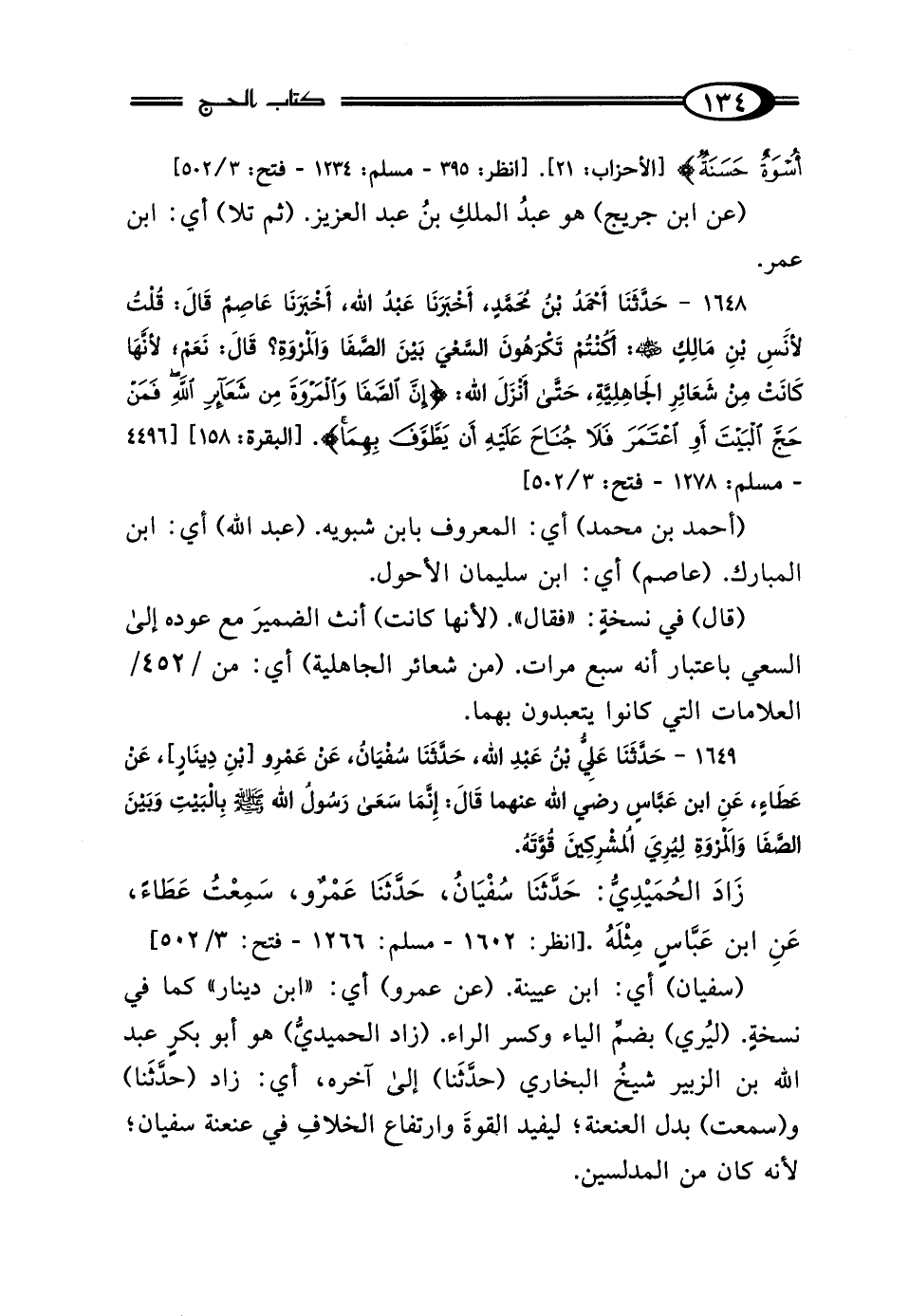 1648 - حَدَّثَنَا أَحْمَدُ بْنُ مُحَمَّدٍ، أَخْبَرَنَا عَبْدُ اللَّهِ، أَخْبَرَنَا عَاصِمٌ قَال: قُلْتُ لِأَنَسِ بْنِ مَالِكٍ رَضِيَ اللَّهُ عَنْهُ أَكُنْتُمْ تَكْرَهُونَ السَّعْيَ بَيْنَ الصَّفَا وَالمَرْوَةِ قَال: "نَعَمْ لِأَنَّهَا كَانَتْ مِنْ شَعَائِرِ الجَاهِلِيَّةِ حَتَّى أَنْزَلَ اللَّهُ": {إِنَّ الصَّفَا وَالمَرْوَةَ مِنْ شَعَائِرِ اللَّهِ فَمَنْ حَجَّ البَيْتَ أَو اعْتَمَرَ فَلَا جُنَاحَ عَلَيْهِ أَنْ يَطَّوَّفَ بِهِمَا} [البقرة: 158] [4496 - مسلم: 1278 - فتح: 3/ 502]