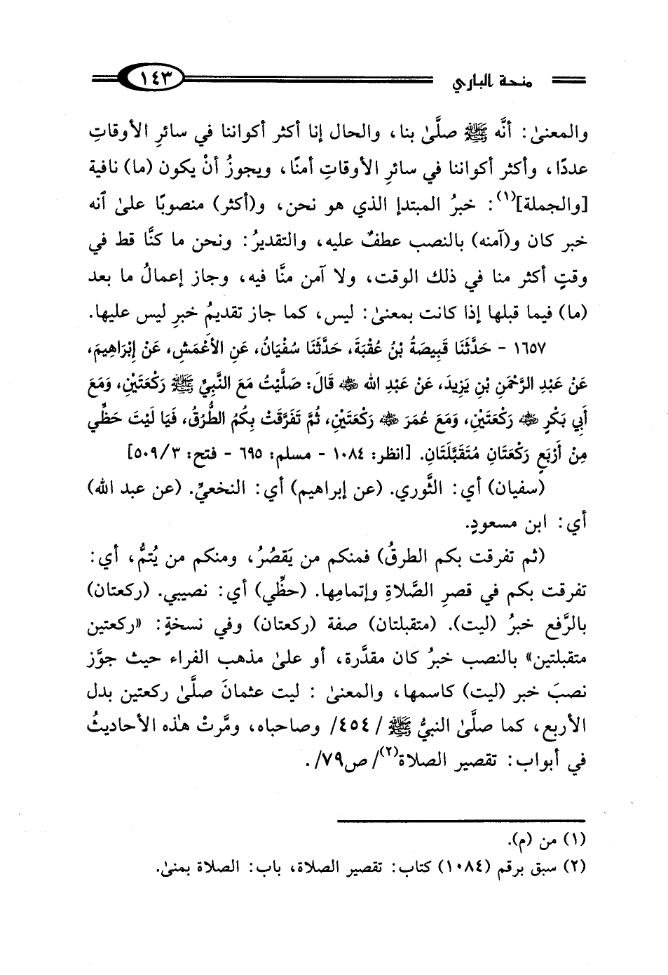 (سفيان) أي: الثَّوري. (عن إبراهيم) أي: النخعيِّ. (عن عبد الله) أي: ابن مسعودٍ. (ثم تفرقت بكم الطرقُ) فمنكم من يَقصُرُ، ومنكم من يُتمُّ، أي: تفرقت بكم في قصرِ الصَّلاةِ وإتمامِها. (حظِّي) أي: نصيبي. (ركعتان) بالرَّفع خبرُ (ليت). (متقبلتان) صفة (ركعتان) وفي نسخةٍ: "ركعتين متقبلتين" بالنصب خبرُ كان مقدَّرة، أو على مذهب الفراء حيث جوَّز نصبَ خبر (ليت) كاسمها، والمعنى: ليت عثمانَ صلَّى ركعتين بدل الأربع، كما صلَّى النبيُّ - صلى الله عليه وسلم - وصاحباه، ومرَّتْ هذه الأحاديثُ في أبواب: تقصير الصلاة (¬2) / ص 79 /.