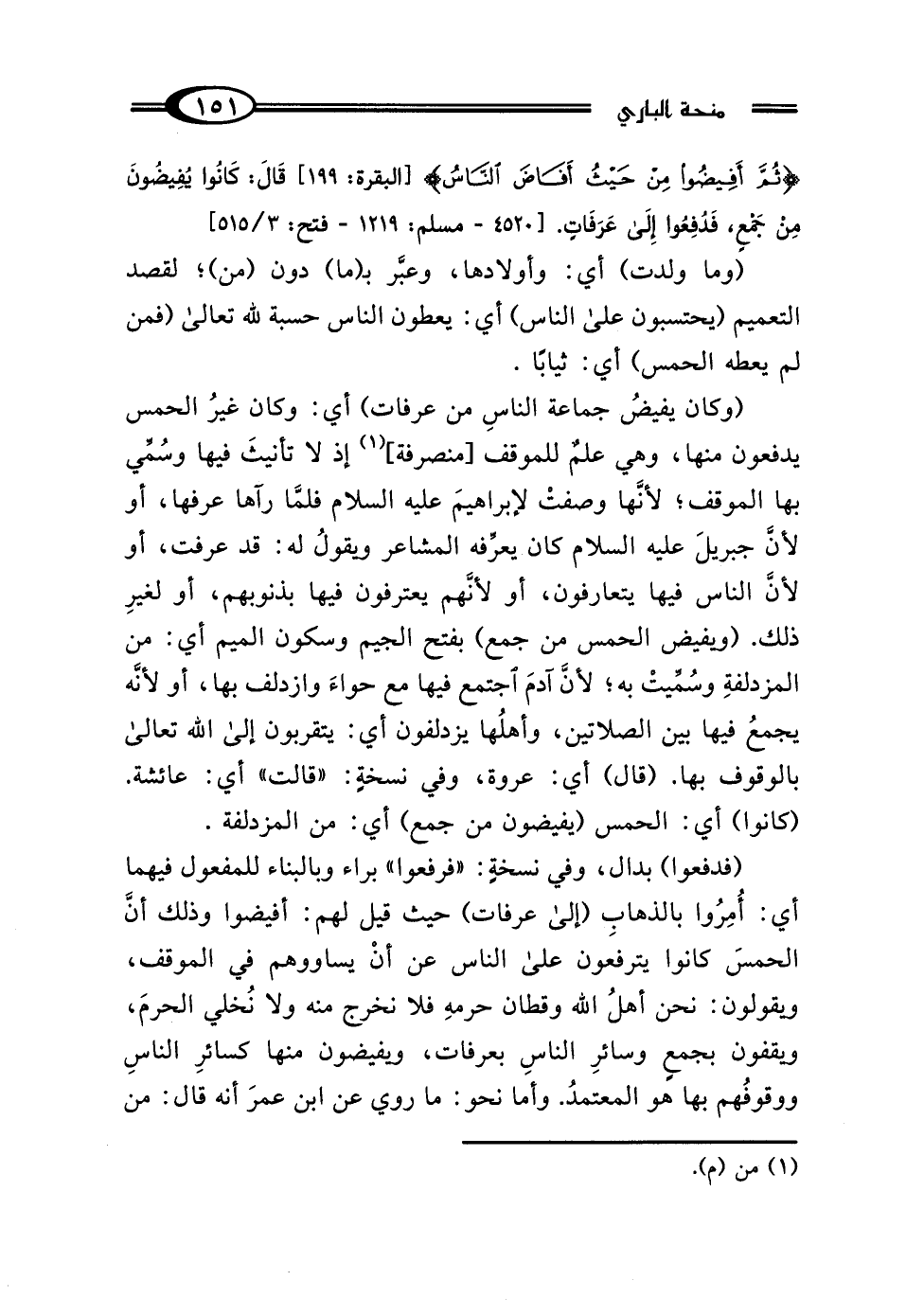 (فدفعوا) بدال، وفي نسخةٍ: "فرفعوا" براء وبالبناء للمفعول فيهما أي: أُمِرُوا بالذهابِ (إلي عرفات) حيث قيل لهم: أفيضوا وذلك أنَّ الحمسَ كانوا يترفعون على الناس عن أنْ يساووهم في الموقف، ويقولون: نحن أهلُ الله وقطان حرمهِ فلا نخرج منه ولا نُخلي الحرمَ، ويقفون بجمعٍ وسائرِ الناسِ بعرفات، ويفيضون منها كسائرِ الناسِ ووقوفُهم بها هو المعتمدُ. وأما نحو: ما روي عن ابن عمرَ أنه قال: من