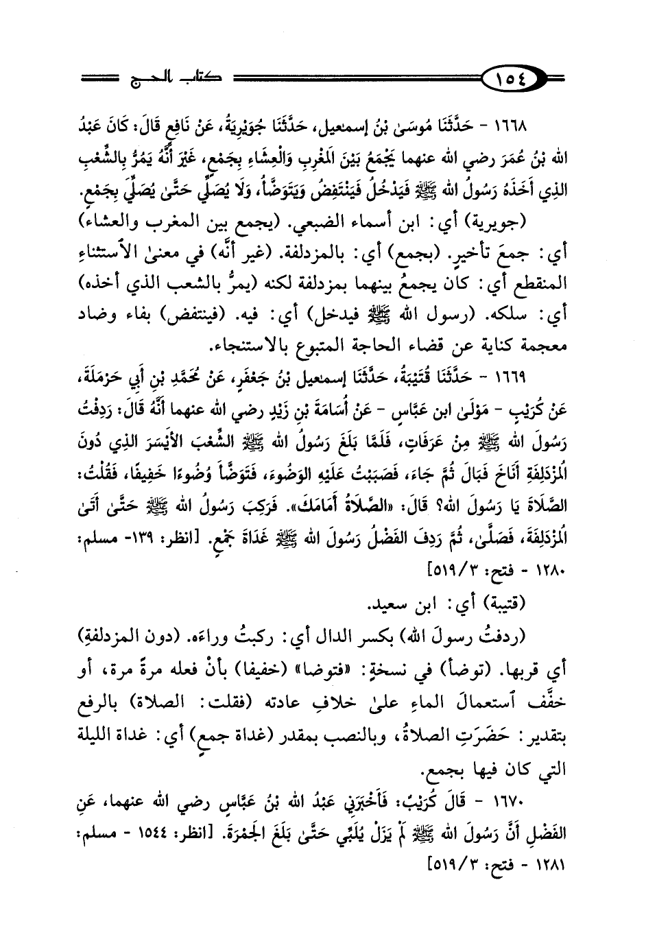 1668 - حَدَّثَنَا مُوسَى بْنُ إِسْمَاعِيلَ، حَدَّثَنَا جُوَيْرِيَةُ، عَنْ نَافِعٍ قَال: كَانَ عَبْدُ اللَّهِ بْنُ عُمَرَ رَضِيَ اللَّهُ عَنْهُمَا "يَجْمَعُ بَيْنَ المَغْرِبِ وَالعِشَاءِ بِجَمْعٍ، غَيْرَ أَنَّهُ يَمُرُّ بِالشِّعْبِ الَّذِي أَخَذَهُ رَسُولُ اللَّهِ صَلَّى اللهُ عَلَيْهِ وَسَلَّمَ، فَيَدْخُلُ، فَيَنْتَفِضُ وَيَتَوَضَّأُ، وَلَا يُصَلِّي حَتَّى يُصَلِّيَ بِجَمْعٍ".