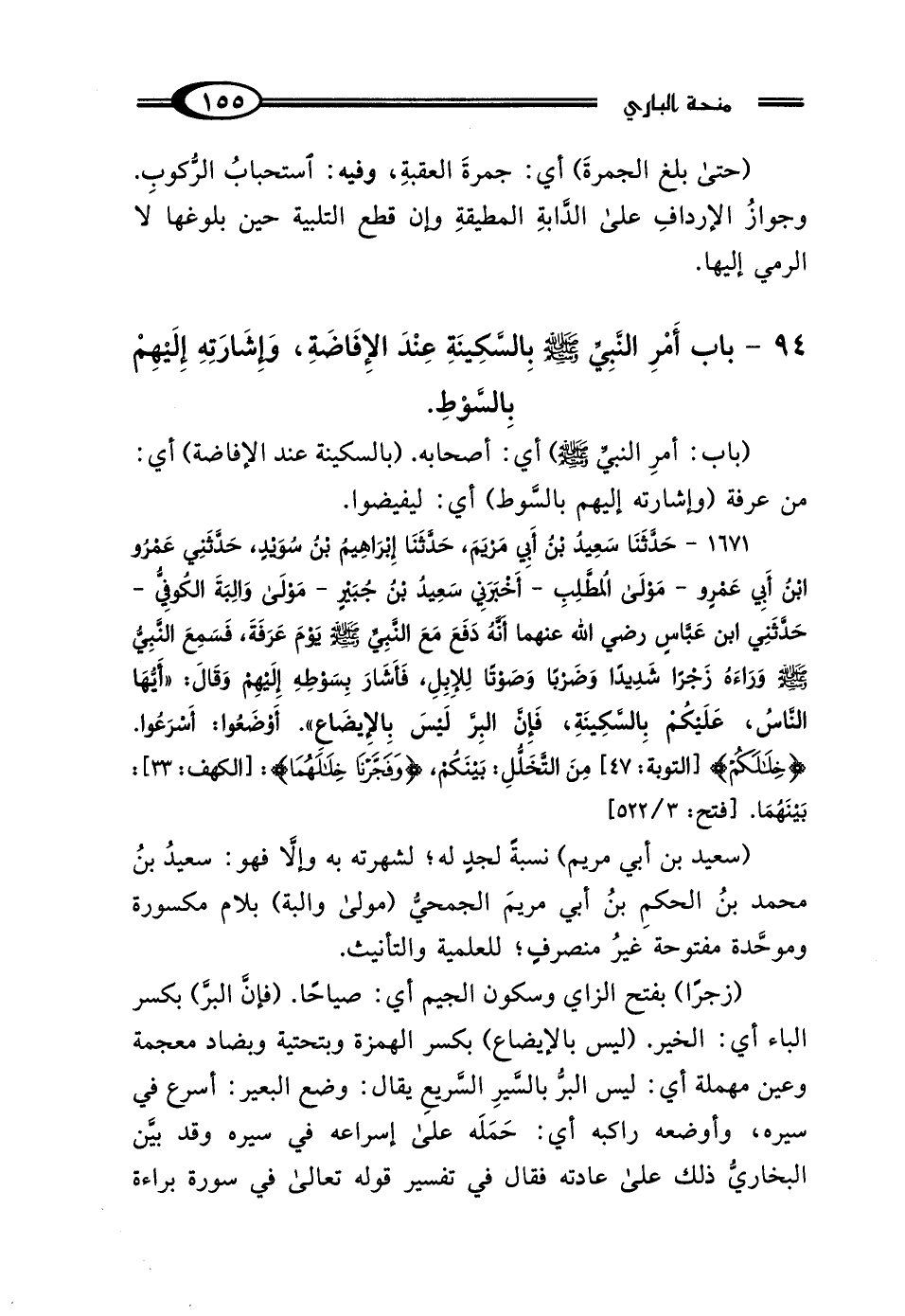 1671 - حَدَّثَنَا سَعِيدُ بْنُ أَبِي مَرْيَمَ، حَدَّثَنَا إِبْرَاهِيمُ بْنُ سُوَيْدٍ، حَدَّثَنِي عَمْرُو بْنُ أَبِي عَمْرٍو، مَوْلَى المُطَّلِبِ، أَخْبَرَنِي سَعِيدُ بْنُ جُبَيْرٍ، مَوْلَى وَالِبَةَ الكُوفِيُّ، حَدَّثَنِي ابْنُ عَبَّاسٍ رَضِيَ اللَّهُ عَنْهُمَا: أَنَّهُ دَفَعَ مَعَ النَّبِيِّ صَلَّى اللهُ عَلَيْهِ وَسَلَّمَ يَوْمَ عَرَفَةَ، فَسَمِعَ النَّبِيُّ صَلَّى اللهُ عَلَيْهِ وَسَلَّمَ وَرَاءَهُ زَجْرًا شَدِيدًا، وَضَرْبًا وَصَوْتًا لِلْإِبِلِ، فَأَشَارَ بِسَوْطِهِ إِلَيْهِمْ، وَقَال: "أَيُّهَا النَّاسُ عَلَيْكُمْ بِالسَّكِينَةِ فَإِنَّ البِرَّ لَيْسَ بِالإِيضَاعِ"، " أَوْضَعُوا: أَسْرَعُوا"، {خِلالكُمْ} [التوبة: 47]: "مِنَ التَّخَلُّلِ بَيْنَكُمْ"، {وَفَجَّرْنَا خِلالهُمَا} [الكهف: 33]: "بَيْنَهُمَا".