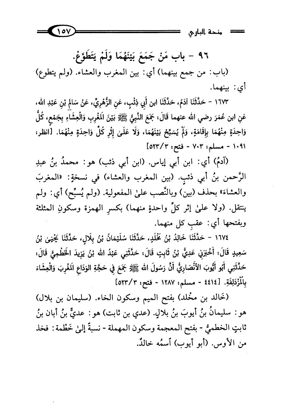 1673 - حَدَّثَنَا آدَمُ، حَدَّثَنَا ابْنُ أَبِي ذِئْبٍ، عَنِ الزُّهْرِيِّ، عَنْ سَالِمِ بْنِ عَبْدِ اللَّهِ، عَنِ ابْنِ عُمَرَ رَضِيَ اللَّهُ عَنْهُمَا قَال: "جَمَعَ النَّبِيُّ صَلَّى اللهُ عَلَيْهِ وَسَلَّمَ بَيْنَ المَغْرِبِ وَالعِشَاءِ بِجَمْعٍ كُلُّ وَاحِدَةٍ مِنْهُمَا بِإِقَامَةٍ، وَلَمْ يُسَبِّحْ بَيْنَهُمَا، وَلَا عَلَى إِثْرِ كُلِّ وَاحِدَةٍ مِنْهُمَا".