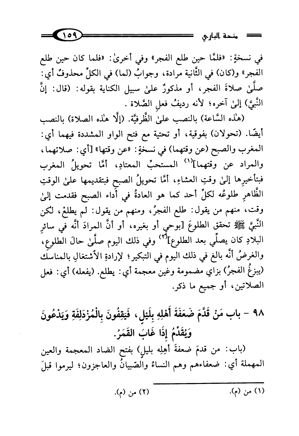 (هذه السَّاعة) بالنصب على الظَّرفيَّة. (إلَّا هذه الصلاة) بالنصب أيضًا. (تحولان) بفوقية، أو تحتية مع فتح الواو المشددة فيهما أي: المغرب والصبح (عن وقتهما) في نسخةٍ: "عن وقتها" [أي: صلاتهما، والمراد عن وقتهما] (¬1) المستحبِّ المعتادِ، أمَّا تحويلُ المغرب فبتأخيرِها إلي وقتِ العشاءِ، أمَّا تحويلُ الصبح فبتقديمها على الوقتِ الظَّاهرِ طلوعُه لكلِّ أحد كما هو العادةُ في أَداء الصبح فقدمت إلى وقت، منهم من يقول: طلع الفجرُ، ومنهم من يقول: لم يطلعْ، لكن النَّبيِّ - صلى الله عليه وسلم - تحقق الطلوعَ [بوحيٍ أو بغيره، أو أنَّ المرادَ أنَّه في سائرِ البلادِ كان يصلِّي بعد الطلوع] (¬2) وفي ذلك اليوم صلَّى حال الطلوعِ، والغرضُ أنَّه بالغ في ذلك اليوم في التبكير؛ لإرادةِ الاشتغالِ بالمناسك (يبزغُ الفجرُ) بزاي مضمومة وغين معجمة أي: يطلع. (يفعله) أي: فعل الصلاتين، أو جميع ما ذكر.