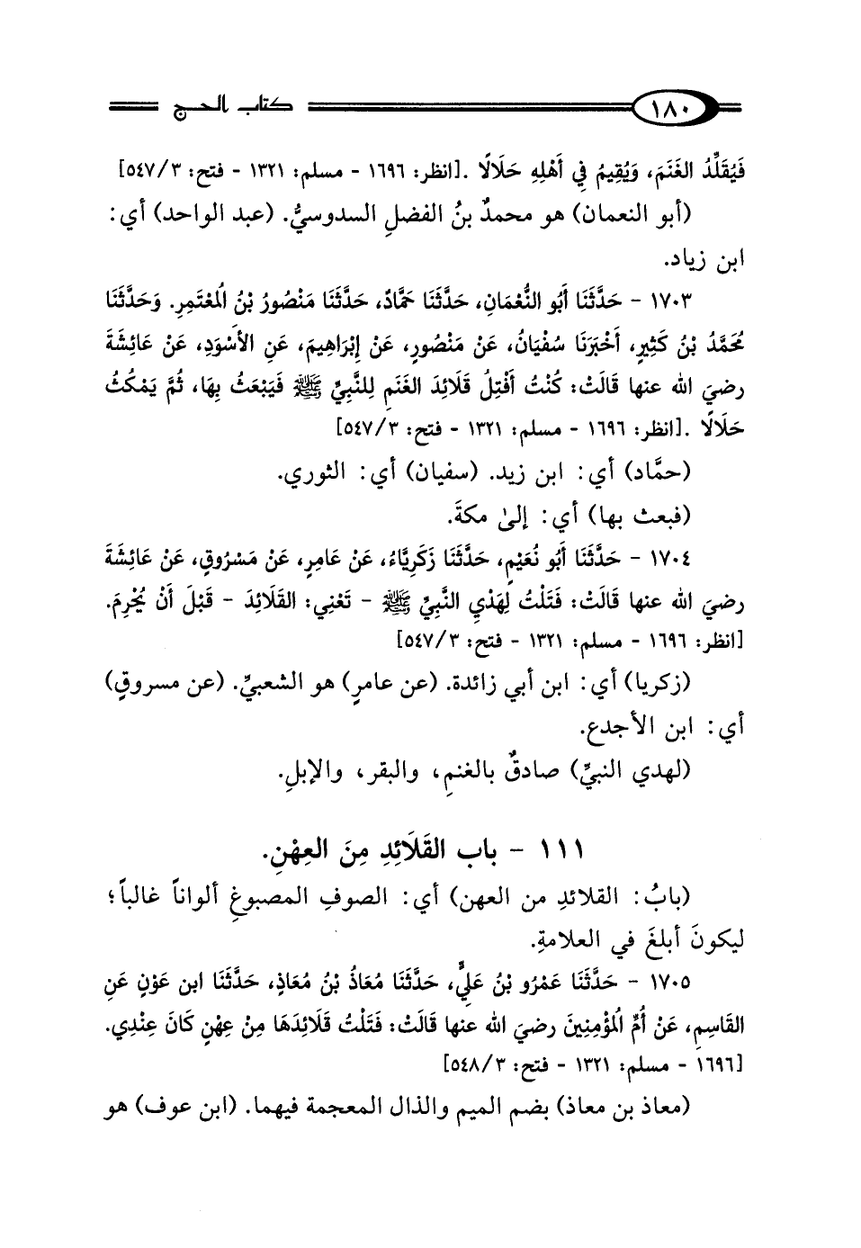 1705 - حَدَّثَنَا عَمْرُو بْنُ عَلِيٍّ، حَدَّثَنَا مُعَاذُ بْنُ مُعَاذٍ، حَدَّثَنَا ابْنُ عَوْنٍ، عَنِ القَاسِمِ، عَنْ أُمِّ المُؤْمِنِينَ رَضِيَ اللَّهُ عَنْهَا قَالتْ: "فَتَلْتُ قَلائِدَهَا مِنْ عِهْنٍ كَانَ عِنْدِي".