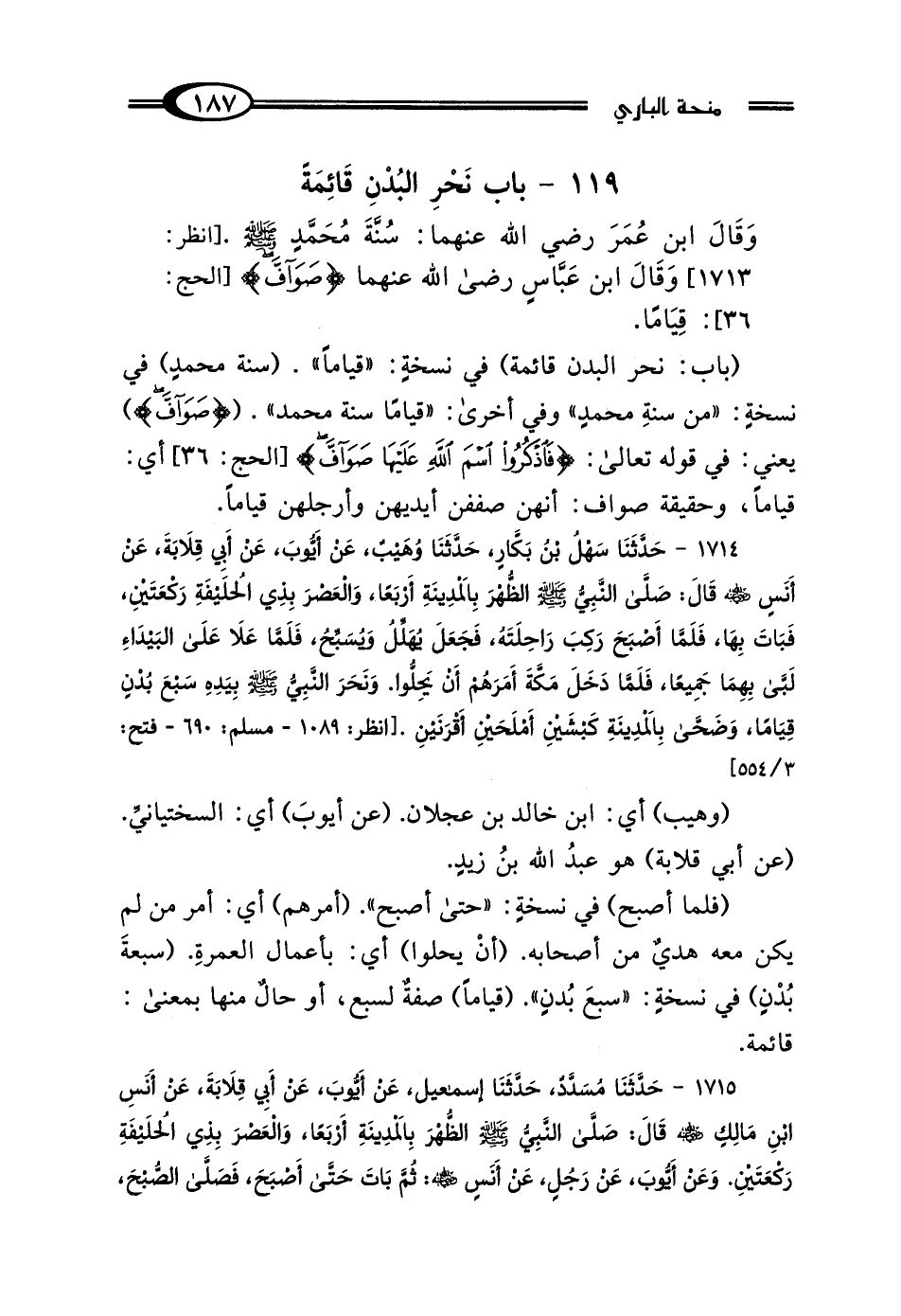 1714 - حَدَّثَنَا سَهْلُ بْنُ بَكَّارٍ، حَدَّثَنَا وُهَيْبٌ، عَنْ أَيُّوبَ، عَنْ أَبِي قِلابَةَ، عَنْ أَنَسٍ رَضِيَ اللَّهُ عَنْهُ قَال: "صَلَّى النَّبِيُّ صَلَّى اللهُ عَلَيْهِ وَسَلَّمَ الظُّهْرَ بِالْمَدِينَةِ أَرْبَعًا، وَالعَصْرَ بِذِي الحُلَيْفَةِ رَكْعَتَيْنِ، فَبَاتَ بِهَا، فَلَمَّا أَصْبَحَ رَكِبَ رَاحِلَتَهُ، فَجَعَلَ يُهَلِّلُ وَيُسَبِّحُ، فَلَمَّا عَلا عَلَى البَيْدَاءِ لَبَّى بِهِمَا جَمِيعًا، فَلَمَّا دَخَلَ مَكَّةَ أَمَرَهُمْ أَنْ يَحِلُّوا، وَنَحَرَ النَّبِيُّ صَلَّى اللهُ عَلَيْهِ وَسَلَّمَ بِيَدِهِ سَبْعَ بُدْنٍ قِيَامًا، وَضَحَّى بِالْمَدِينَةِ كَبْشَيْنِ أَمْلَحَيْنِ أَقْرَنَيْنِ".