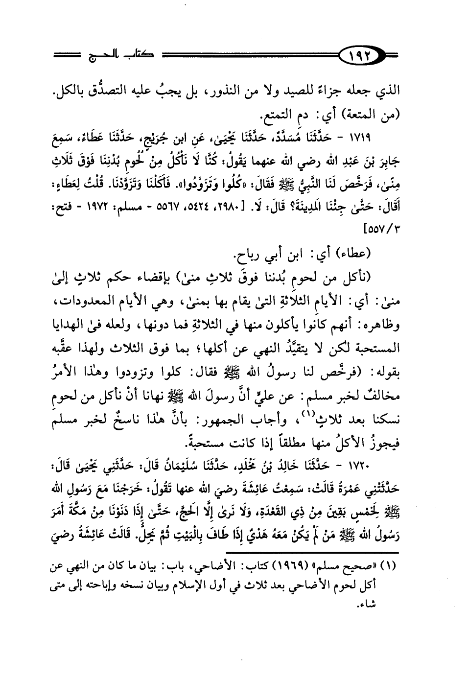 1719 - حَدَّثَنَا مُسَدَّدٌ، حَدَّثَنَا يَحْيَى، عَنِ ابْنِ جُرَيْجٍ، حَدَّثَنَا عَطَاءٌ، سَمِعَ جَابِرَ بْنَ عَبْدِ اللَّهِ رَضِيَ اللَّهُ عَنْهُمَا يَقُولُ: كُنَّا لَا نَأْكُلُ مِنْ لُحُومِ بُدْنِنَا فَوْقَ ثَلاثِ مِنًى، فَرَخَّصَ لَنَا النَّبِيُّ صَلَّى اللهُ عَلَيْهِ وَسَلَّمَ فَقَال: "كُلُوا وَتَزَوَّدُوا"، فَأَكَلْنَا وَتَزَوَّدْنَا قُلْتُ لِعَطَاءٍ: أَقَال: حَتَّى جِئْنَا المَدِينَةَ؟ قَال: لَا.