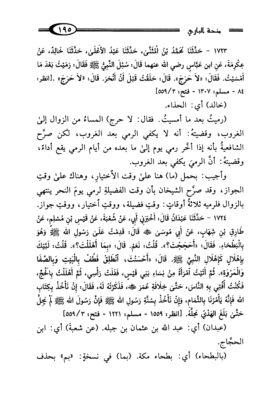 1723 - حَدَّثَنَا مُحَمَّدُ بْنُ المُثَنَّى، حَدَّثَنَا عَبْدُ الأَعْلَى، حَدَّثَنَا خَالِدٌ، عَنْ عِكْرِمَةَ، عَنِ ابْنِ عَبَّاسٍ رَضِيَ اللَّهُ عَنْهُمَا، قَال: سُئِلَ النَّبِيُّ صَلَّى اللهُ عَلَيْهِ وَسَلَّمَ فَقَال: رَمَيْتُ بَعْدَ مَا أَمْسَيْتُ فَقَال: "لَا حَرَجَ"، قَال: حَلَقْتُ قَبْلَ أَنْ أَنْحَرَ، قَال: "لَا حَرَجَ".