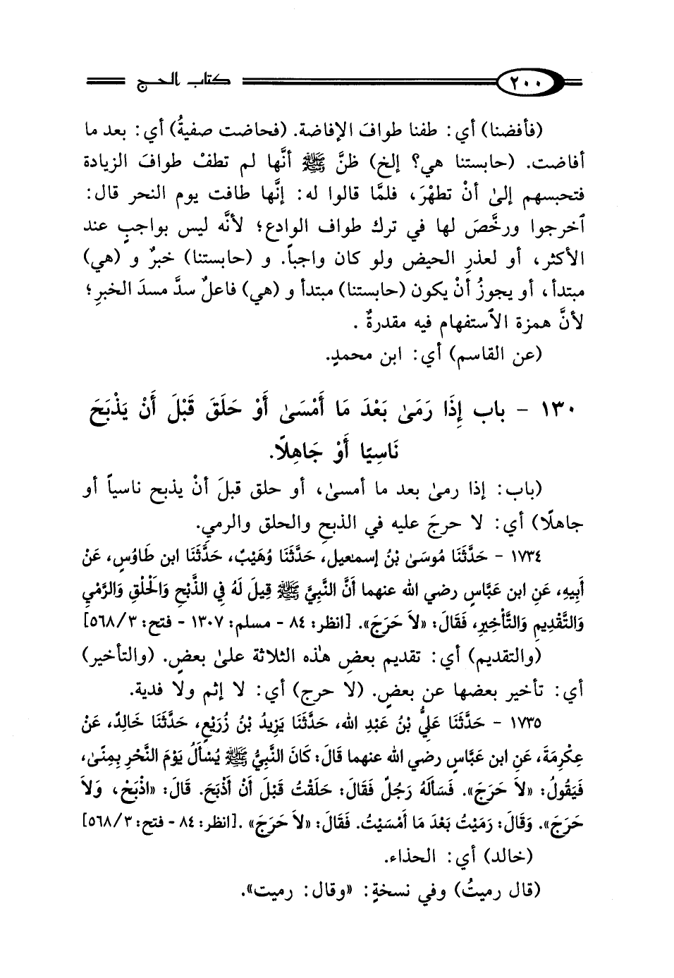 130 - بَابُ إِذَا رَمَى بَعْدَ مَا أَمْسَى، أَوْ حَلَقَ قَبْلَ أَنْ يَذْبَحَ، نَاسِيًا أَوْ جَاهِلًا