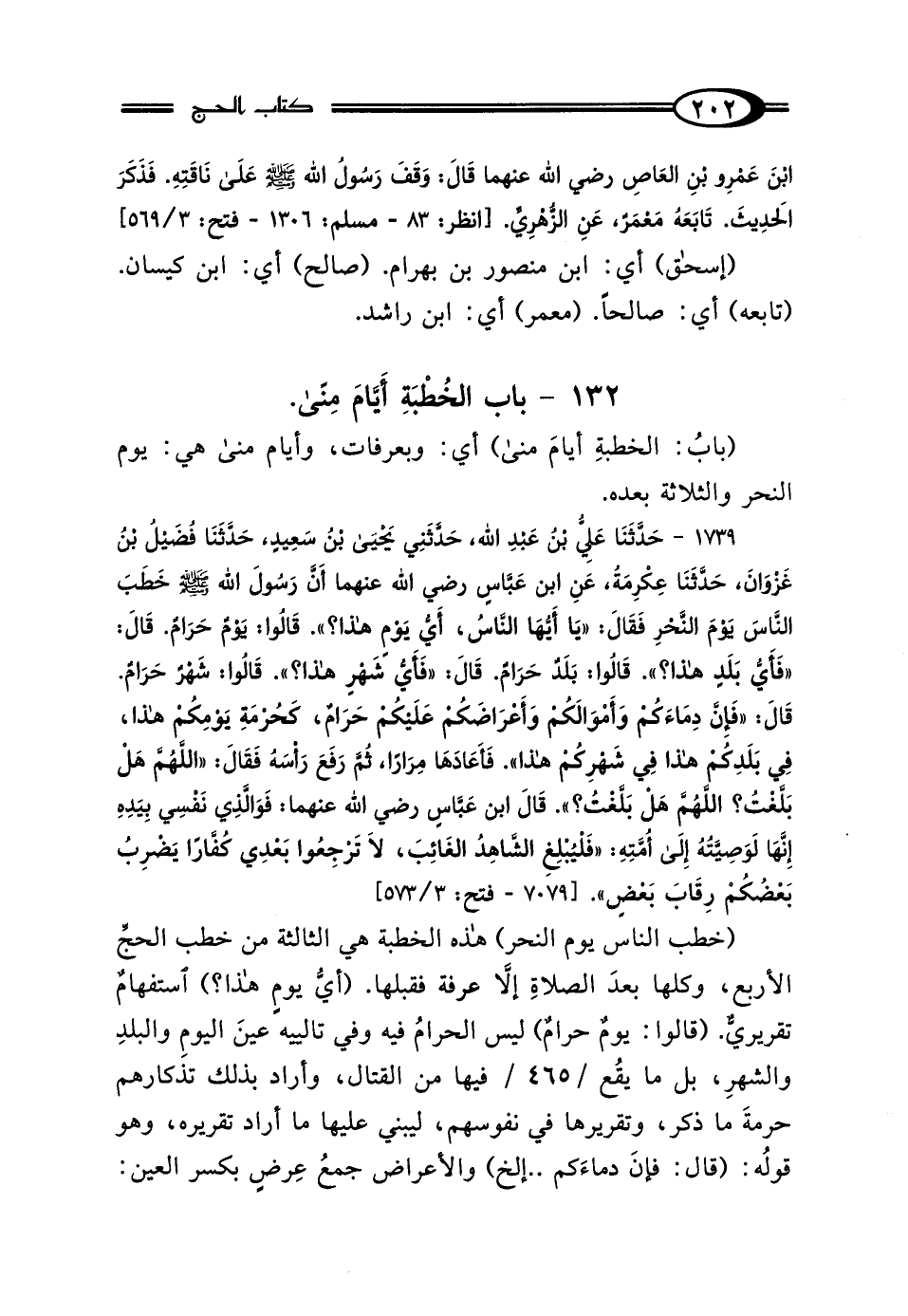 1739 - حَدَّثَنَا عَلِيُّ بْنُ عَبْدِ اللَّهِ، حَدَّثَنِي يَحْيَى بْنُ سَعِيدٍ، حَدَّثَنَا فُضَيْلُ بْنُ غَزْوَانَ، حَدَّثَنَا عِكْرِمَةُ، عَنِ ابْنِ عَبَّاسٍ رَضِيَ اللَّهُ عَنْهُمَا، أَنَّ رَسُولَ اللَّهِ صَلَّى اللهُ عَلَيْهِ وَسَلَّمَ خَطَبَ النَّاسَ يَوْمَ النَّحْرِ فَقَال: "يَا أَيُّهَا النَّاسُ أَيُّ يَوْمٍ هَذَا؟ "، قَالُوا: يَوْمٌ حَرَامٌ، قَال: "فَأَيُّ بَلَدٍ هَذَا؟ "، قَالُوا: بَلَدٌ حَرَامٌ، قَال: "فَأَيُّ شَهْرٍ هَذَا؟ "، قَالُوا: شَهْرٌ حَرَامٌ"، قَال: "فَإِنَّ دِمَاءَكُمْ وَأَمْوَالكُمْ وَأَعْرَاضَكُمْ عَلَيْكُمْ حَرَامٌ، كَحُرْمَةِ يَوْمِكُمْ هَذَا، فِي بَلَدِكُمْ هَذَا، فِي شَهْرِكُمْ هَذَا"، فَأَعَادَهَا مِرَارًا، ثُمَّ رَفَعَ رَأْسَهُ فَقَال: "اللَّهُمَّ هَلْ بَلَّغْتُ، اللَّهُمَّ هَلْ بَلَّغْتُ - قَال ابْنُ عَبَّاسٍ رَضِيَ اللَّهُ عَنْهُمَا: فَوَالَّذِي نَفْسِي بِيَدِهِ، إِنَّهَا لَوَصِيَّتُهُ إِلَى أُمَّتِهِ، فَلْيُبْلِغِ الشَّاهِدُ الغَائِبَ، لَا تَرْجِعُوا بَعْدِي كُفَّارًا، يَضْرِبُ بَعْضُكُمْ رِقَابَ بَعْضٍ".