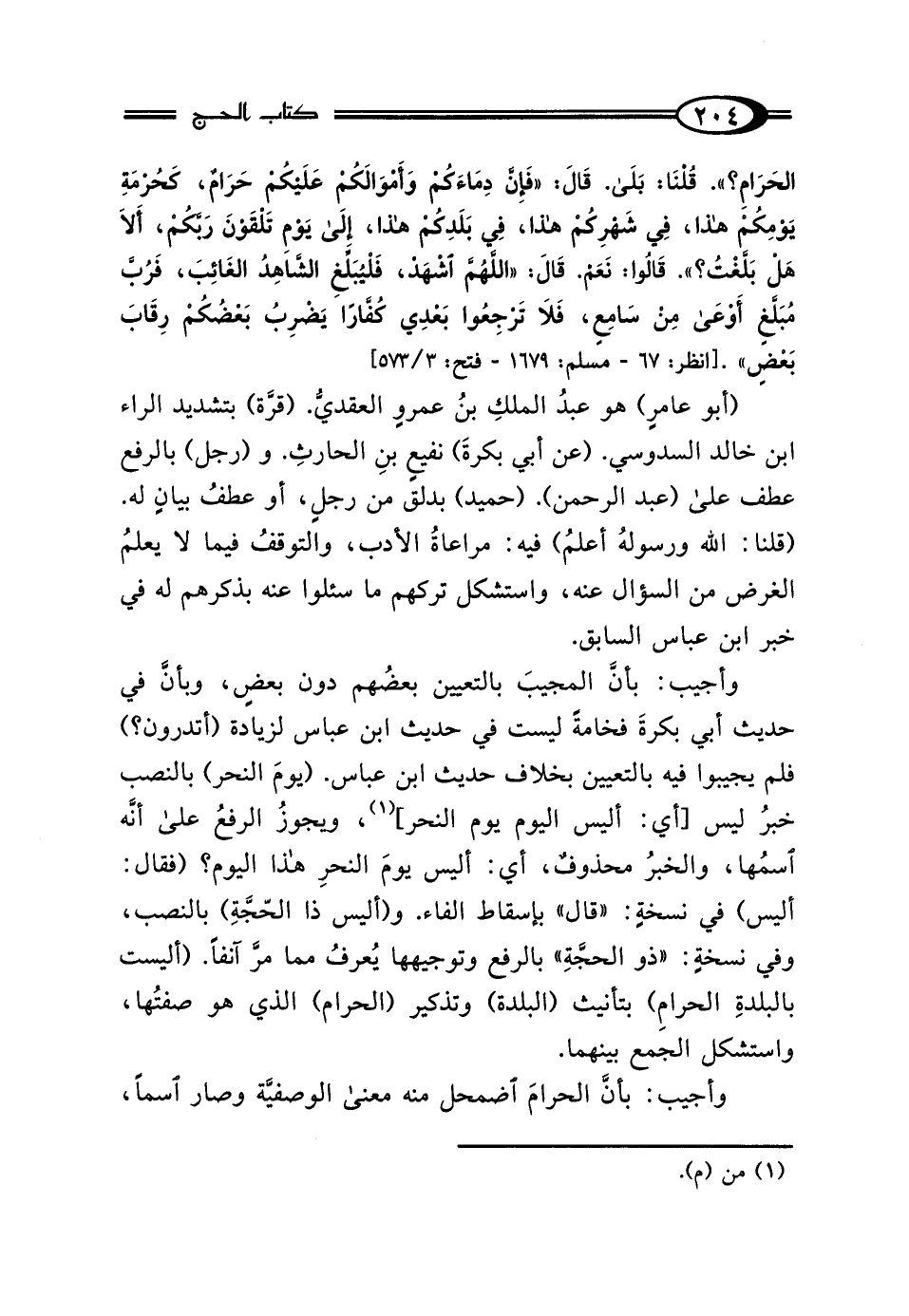 وأجيب: بأنَّ المجيبَ بالتعيين بعضُهم دون بعضٍ، وبأن في حديث أبي بكرةَ فخامةً ليست في حديث ابن عباس لزيادة (أتدرون؟) فلم يجيبوا فيه بالتعيين بخلاف حديث ابن عباس. (يومَ النحر) بالنصب خبرُ ليس [أي: أليس اليوم يوم النحر] (¬1)، ويجوزُ الرفعُ على أنَّه اسمُها، والخبرُ محذوف، أي: أليس يومَ النحرِ هذا اليوم؟ (فقال: أليس) في نسخةٍ: "قال" بإسقاط الفاء. و (أليس ذا الحجَّةِ) بالنصب، وفي نسخةٍ: "ذو الحجةِ" بالرفع وتوجيهها يُعرفُ مما مر آنفًا. (أليست بالبلدةِ الحرامِ) بتأنيث (البلدة) وتذكير (الحرام) الذي هو صفتُها، واستشكل الجمع بينهما.