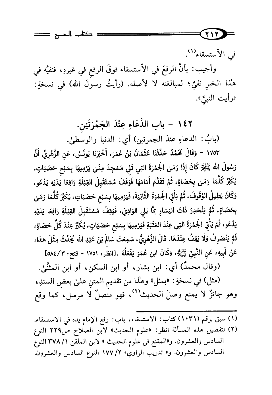 1753 - وَقَال مُحَمَّدٌ: حَدَّثَنَا عُثْمَانُ بْنُ عُمَرَ، أَخْبَرَنَا يُونُسُ، عَنِ الزُّهْرِيِّ، "أَنَّ رَسُولَ اللَّهِ صَلَّى اللهُ عَلَيْهِ وَسَلَّمَ كَانَ إِذَا رَمَى الجَمْرَةَ الَّتِي تَلِي مَسْجِدَ مِنًى يَرْمِيهَا بِسَبْعِ حَصَيَاتٍ، يُكَبِّرُ كُلَّمَا رَمَى بِحَصَاةٍ، ثُمَّ تَقَدَّمَ أَمَامَهَا، فَوَقَفَ مُسْتَقْبِلَ القِبْلَةِ، رَافِعًا يَدَيْهِ يَدْعُو، وَكَانَ يُطِيلُ الوُقُوفَ، ثُمَّ يَأْتِي الجَمْرَةَ الثَّانِيَةَ، فَيَرْمِيهَا بِسَبْعِ حَصَيَاتٍ، يُكَبِّرُ كُلَّمَا رَمَى بِحَصَاةٍ، ثُمَّ يَنْحَدِرُ ذَاتَ اليَسَارِ، مِمَّا يَلِي الوَادِيَ، فَيَقِفُ مُسْتَقْبِلَ القِبْلَةِ رَافِعًا يَدَيْهِ يَدْعُو، ثُمَّ يَأْتِي الجَمْرَةَ الَّتِي عِنْدَ العَقَبَةِ، فَيَرْمِيهَا بِسَبْعِ حَصَيَاتٍ، يُكَبِّرُ عِنْدَ كُلِّ حَصَاةٍ، ثُمَّ يَنْصَرِفُ وَلَا يَقِفُ عِنْدَهَا" قَال الزُّهْرِيُّ: سَمِعْتُ سَالِمَ بْنَ عَبْدِ اللَّهِ، يُحَدِّثُ مِثْلَ هَذَا، عَنْ أَبِيهِ عَنِ النَّبِيِّ صَلَّى اللهُ عَلَيْهِ وَسَلَّمَ وَكَانَ ابْنُ عُمَرَ يَفْعَلُهُ.