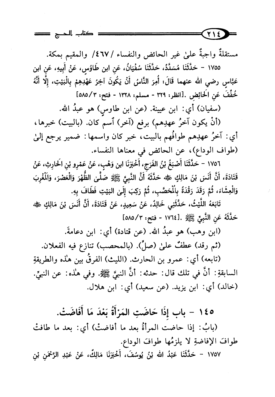 1755 - حَدَّثَنَا مُسَدَّدٌ، حَدَّثَنَا سُفْيَانُ، عَنِ ابْنِ طَاوُسٍ، عَنْ أَبِيهِ، عَنِ ابْنِ عَبَّاسٍ رَضِيَ اللَّهُ عَنْهُمَا قَال: "أُمِرَ النَّاسُ أَنْ يَكُونَ آخِرُ عَهْدِهِمْ بِالْبَيْتِ، إلا أَنَّهُ خُفِّفَ عَنِ الحَائِضِ".