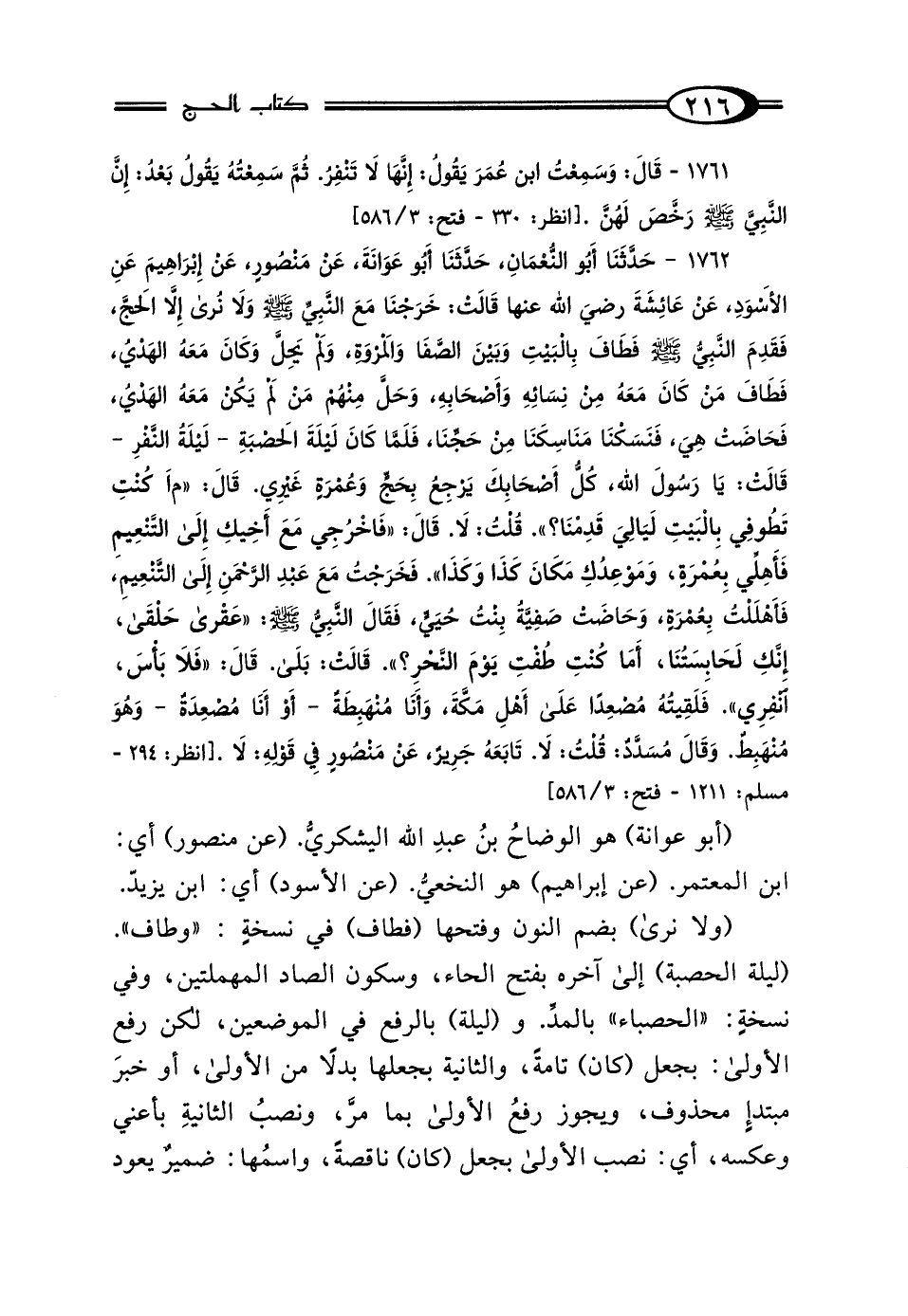 1762 - حَدَّثَنَا أَبُو النُّعْمَانِ، حَدَّثَنَا أَبُو عَوَانَةَ، عَنْ مَنْصُورٍ، عَنْ إِبْرَاهِيمَ، عَنِ الأَسْوَدِ، عَنْ عَائِشَةَ رَضِيَ اللَّهُ عَنْهَا قَالتْ: خَرَجْنَا مَعَ النَّبِيِّ صَلَّى اللهُ عَلَيْهِ وَسَلَّمَ وَلَا نَرَى إلا الحَجَّ، فَقَدِمَ النَّبِيُّ صَلَّى اللهُ عَلَيْهِ وَسَلَّمَ، فَطَافَ بِالْبَيْتِ، وَبَيْنَ الصَّفَا وَالمَرْوَةِ وَلَمْ يَحِلَّ، وَكَانَ مَعَهُ الهَدْيُ، فَطَافَ مَنْ كَانَ مَعَهُ مِنْ نِسَائِهِ وَأَصْحَابِهِ، وَحَلَّ مِنْهُمْ مَنْ لَمْ يَكُنْ مَعَهُ الهَدْيُ، فَحَاضَتْ هِيَ، فَنَسَكْنَا مَنَاسِكَنَا مِنْ حَجِّنَا، فَلَمَّا كَانَ لَيْلَةَ الحَصْبَةِ، لَيْلَةُ النَّفْرِ، قَالتْ: يَا رَسُولَ اللَّهِ، كُلُّ أَصْحَابِكَ يَرْجِعُ بِحَجٍّ وَعُمْرَةٍ غَيْرِي، قَال: "مَا كُنْتِ تَطُوفِينَ بِالْبَيْتِ لَيَالِيَ قَدِمْنَا" قُلْتُ: لَا، قَال: "فَاخْرُجِي مَعَ أَخِيكِ إِلَى التَّنْعِيمِ، فَأَهِلِّي بِعُمْرَةٍ، وَمَوْعِدُكِ مَكَانَ كَذَا وَكَذَا". فَخَرَجْتُ مَعَ عَبْدِ الرَّحْمَنِ إِلَى التَّنْعِيمِ، فَأَهْلَلْتُ بِعُمْرَةٍ، وَحَاضَتْ صَفِيَّةُ بِنْتُ حُيَيٍّ، فَقَال النَّبِيُّ صَلَّى اللهُ عَلَيْهِ وَسَلَّمَ: "عَقْرَى حَلْقَى، إِنَّكِ لَحَابِسَتُنَا، أَمَا كُنْتِ طُفْتِ يَوْمَ النَّحْرِ؟ " قَالتْ: بَلَى، قَال: "فَلَا بَأْسَ انْفِرِي" فَلَقِيتُهُ مُصْعِدًا عَلَى أَهْلِ مَكَّةَ، وَأَنَا مُنْهَبِطَةٌ، أَوْ أَنَا مُصْعِدَةٌ وَهُوَ مُنْهَبِطٌ، وَقَال مُسَدَّدٌ: قُلْتُ: لَا، تَابَعَهُ جَرِيرٌ، عَنْ مَنْصُورٍ فِي قَوْلِهِ: لَا.