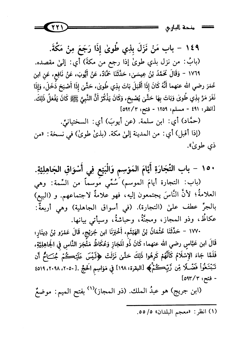 1770 - حَدَّثَنَا عُثْمَانُ بْنُ الهَيْثَمِ، أَخْبَرَنَا ابْنُ جُرَيْجٍ، قَال عَمْرُو بْنُ دِينَارٍ: قَال: ابْنُ عَبَّاسٍ رَضِيَ اللَّهُ عَنْهُمَا: "كَانَ ذُو المَجَازِ، وَعُكَاظٌ مَتْجَرَ النَّاسِ فِي الجَاهِلِيَّةِ، فَلَمَّا جَاءَ الإِسْلامُ كَأَنَّهُمْ كَرِهُوا ذَلِكَ، حَتَّى نَزَلَتْ: {لَيْسَ عَلَيْكُمْ جُنَاحٌ أَنْ تَبْتَغُوا فَضْلًا مِنْ رَبِّكُمْ} [البقرة: 198] فِي مَوَاسِمِ الحَجِّ " [2050، 2089، 4519 - فتح: 3/ 593]