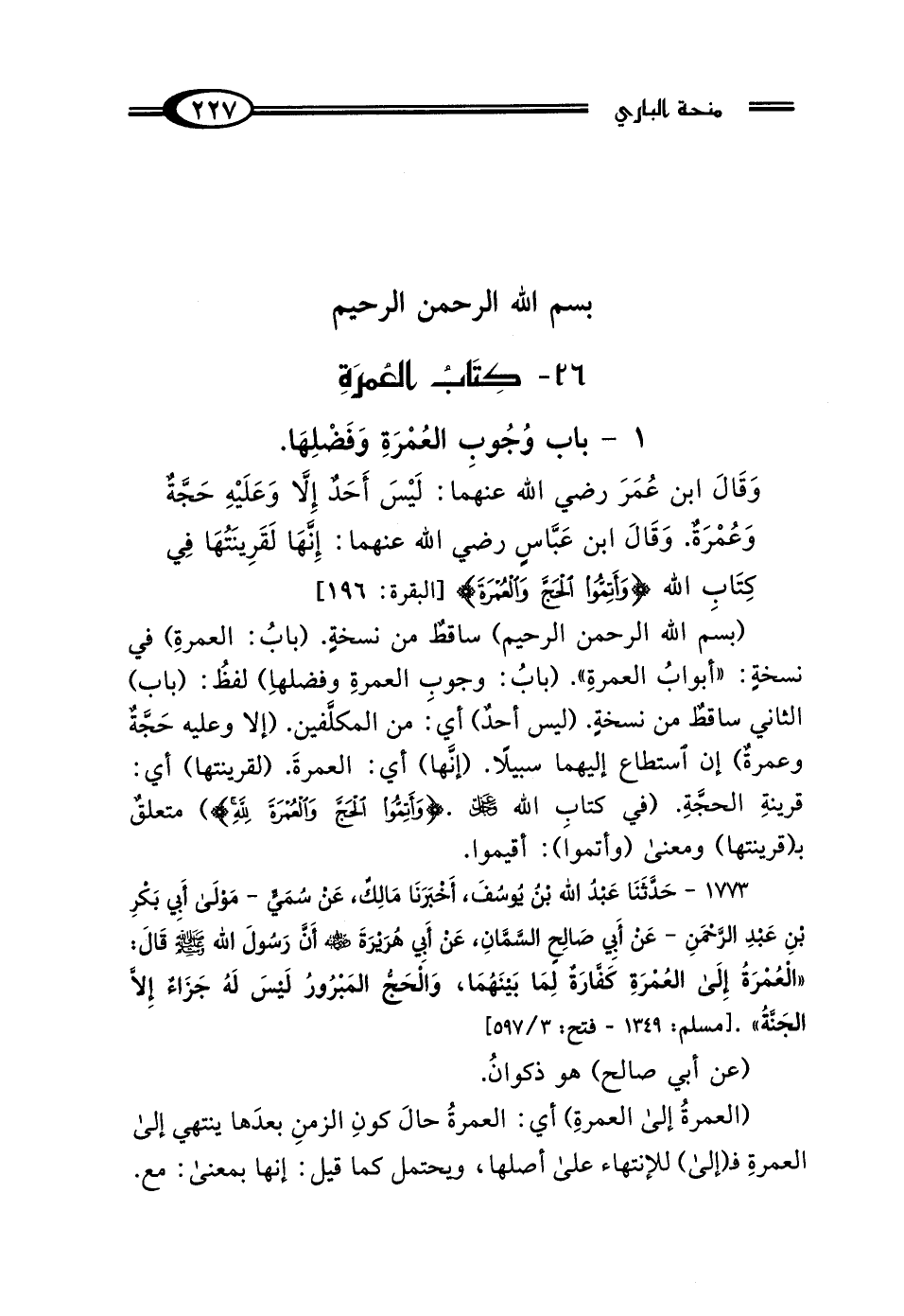 (بِسْمِ اللَّهِ الرَّحْمَنِ الرَّحِيمِ) ساقطٌ من نسخةٍ. (بابُ: العمرةِ) في نسخةٍ: "أبوابُ العمرة". (بابُ: وجوبِ العمرةِ وفضلهاِ) لفظُ: (باب) الثاني ساقطٌ من نسخةٍ. (ليس أحدٌ) أي: من المكلَّفين. (إلا وعليه حَجَّةٌ وعمرة إن استطاع إليهما سبيلًا. (إنَّها) أي: العمرةَ. (لقرينتها) أي: قرينةِ الحجَّةِ. (في كتابِ الله عزَّ وجلَّ). {وَأَتِمُّوا الْحَجَّ وَالْعُمْرَةَ} متعلق بـ (قرينتها) ومعنى (وأتموا): أقيموا.