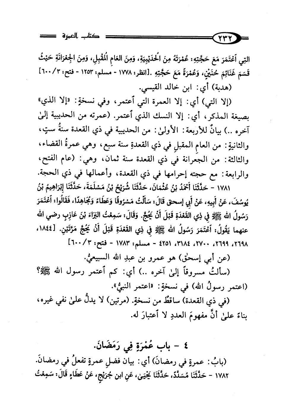 الَّتِي اعْتَمَرَ مَعَ حَجَّتِهِ عُمْرَتَهُ مِنَ الحُدَيْبِيَةِ، وَمِنَ العَامِ المُقْبِلِ وَمِنَ الجِعْرَانَةِ، حَيْثُ قَسَمَ غَنَائِمَ حُنَيْنٍ، وَعُمْرَةً مَعَ حَجَّتِهِ.