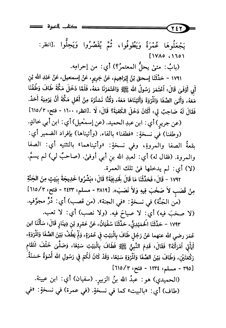 1791 - حَدَّثَنَا إِسْحَاقُ بْنُ إِبْرَاهِيمَ، عَنْ جَرِيرٍ، عَنْ إِسْمَاعِيلَ، عَنْ عَبْدِ اللَّهِ بْنِ أَبِي أَوْفَى، قَال: "اعْتَمَرَ رَسُولُ اللَّهِ صَلَّى اللهُ عَلَيْهِ وَسَلَّمَ، وَاعْتَمَرْنَا مَعَهُ، فَلَمَّا دَخَلَ مَكَّةَ طَافَ وَطُفْنَا مَعَهُ، وَأَتَى الصَّفَا وَالمَرْوَةَ وَأَتَيْنَاهَا مَعَهُ" وَكُنَّا نَسْتُرُهُ مِنْ أَهْلِ مَكَّةَ أَنْ يَرْمِيَهُ أَحَدٌ، فَقَال لَهُ صَاحِبٌ لِي: أَكَانَ دَخَلَ الكَعْبَةَ؟. قَال: لَا.