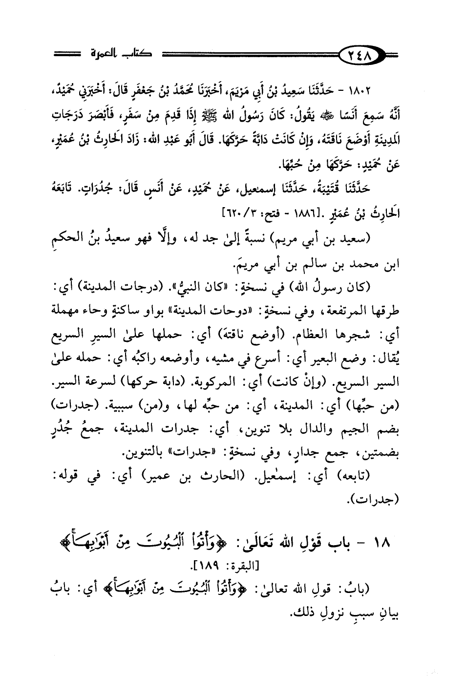 1802 - حَدَّثَنَا سَعِيدُ بْنُ أَبِي مَرْيَمَ، أَخْبَرَنَا مُحَمَّدُ بْنُ جَعْفَرٍ، قَال: أَخْبَرَنِي حُمَيْدٌ، أَنَّهُ سَمِعَ أَنَسًا رَضِيَ اللَّهُ عَنْهُ، يَقُولُ: "كَانَ رَسُولُ اللَّهِ صَلَّى اللهُ عَلَيْهِ وَسَلَّمَ إِذَا قَدِمَ مِنْ سَفَرٍ، فَأَبْصَرَ دَرَجَاتِ المَدِينَةِ، أَوْضَعَ نَاقَتَهُ، وَإِنْ كَانَتْ دَابَّةً حَرَّكَهَا"، قَال أَبُو عَبْدِ اللَّهِ: زَادَ الحَارِثُ بْنُ عُمَيْرٍ، عَنْ حُمَيْدٍ: حَرَّكَهَا مِنْ حُبِّهَا. حَدَّثَنَا قُتَيْبَةُ، حَدَّثَنَا إِسْمَاعِيلُ، عَنْ حُمَيْدٍ، عَنْ أَنَسٍ، قَال: جُدُرَاتِ، تَابَعَهُ الحَارِثُ بْنُ عُمَيْرٍ.