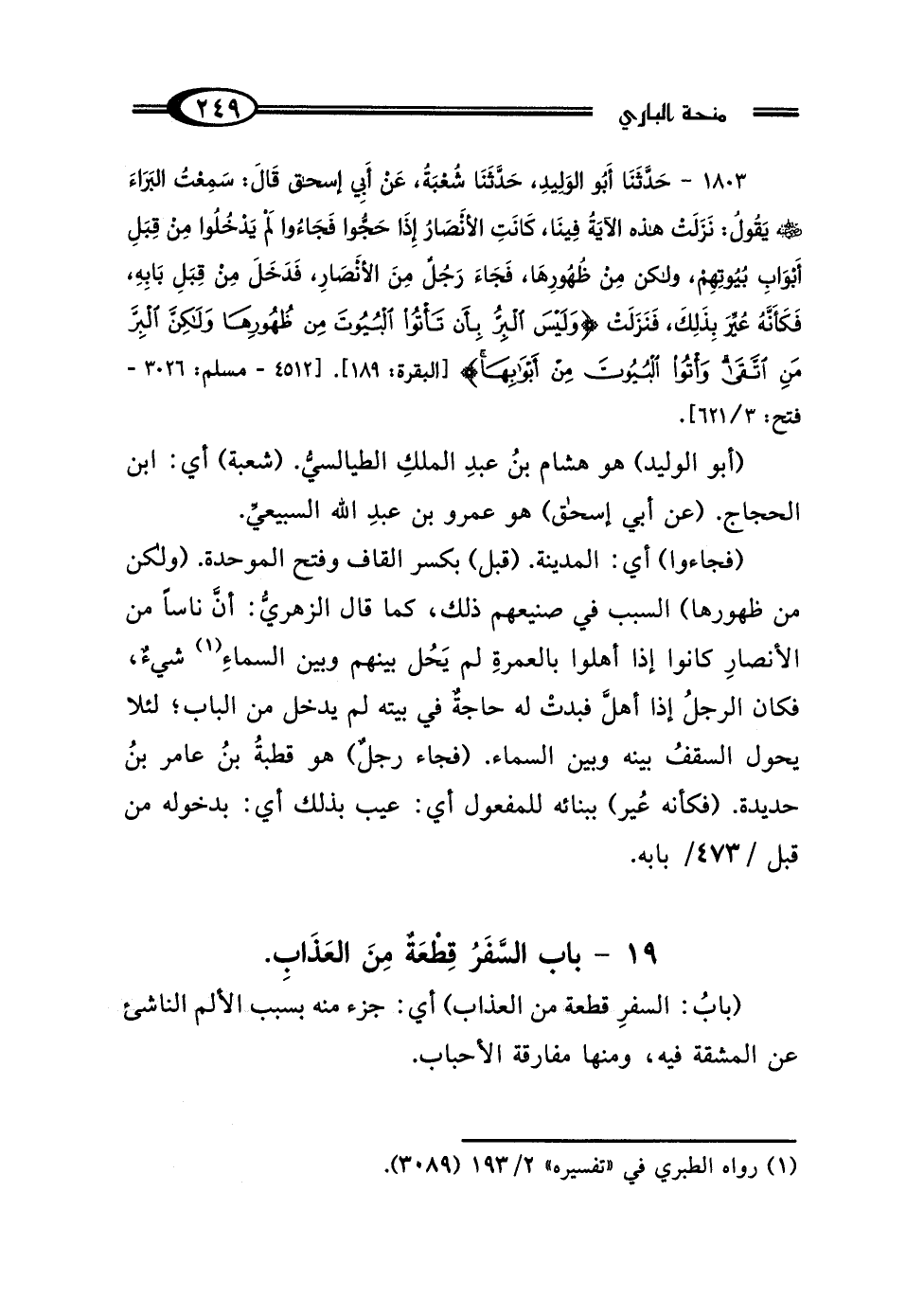 1803 - حَدَّثَنَا أَبُو الوَلِيدِ، حَدَّثَنَا شُعْبَةُ، عَنْ أَبِي إِسْحَاقَ، قَال: سَمِعْتُ البَرَاءَ رَضِيَ اللَّهُ عَنْهُ، يَقُولُ: "نَزَلَتْ هَذِهِ الآيَةُ فِينَا، كَانَتِ الأَنْصَارُ إِذَا حَجُّوا فَجَاءُوا، لَمْ يَدْخُلُوا مِنْ قِبَلِ أَبْوَابِ بُيُوتِهِمْ، وَلَكِنْ مِنْ ظُهُورِهَا، فَجَاءَ رَجُلٌ مِنَ الأَنْصَارِ، فَدَخَلَ مِنْ قِبَلِ بَابِهِ، فَكَأَنَّهُ عُيِّرَ بِذَلِكَ، فَنَزَلَتْ": {وَلَيْسَ البِرُّ بِأَنْ تَأْتُوا البُيُوتَ مِنْ ظُهُورِهَا، وَلَكِنَّ البِرَّ مَنِ اتَّقَى، وَأْتُوا البُيُوتَ مِنْ أَبْوَابِهَا} [البقرة: 189] [4512 - مسلم: 3026 - فتح: 3/ 621]