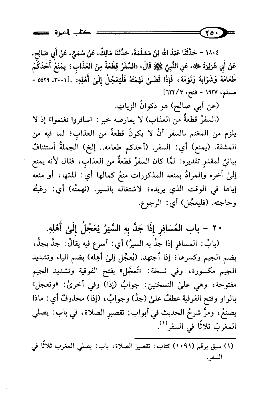 1804 - حَدَّثَنَا عَبْدُ اللَّهِ بْنُ مَسْلَمَةَ، حَدَّثَنَا مَالِكٌ، عَنْ سُمَيٍّ، عَنْ أَبِي صَالِحٍ، عَنْ أَبِي هُرَيْرَةَ رَضِيَ اللَّهُ عَنْهُ، عَنِ النَّبِيِّ صَلَّى اللهُ عَلَيْهِ وَسَلَّمَ، قَال: "السَّفَرُ قِطْعَةٌ مِنَ العَذَابِ، يَمْنَعُ أَحَدَكُمْ طَعَامَهُ وَشَرَابَهُ وَنَوْمَهُ، فَإِذَا قَضَى نَهْمَتَهُ، فَلْيُعَجِّلْ إِلَى أَهْلِهِ".