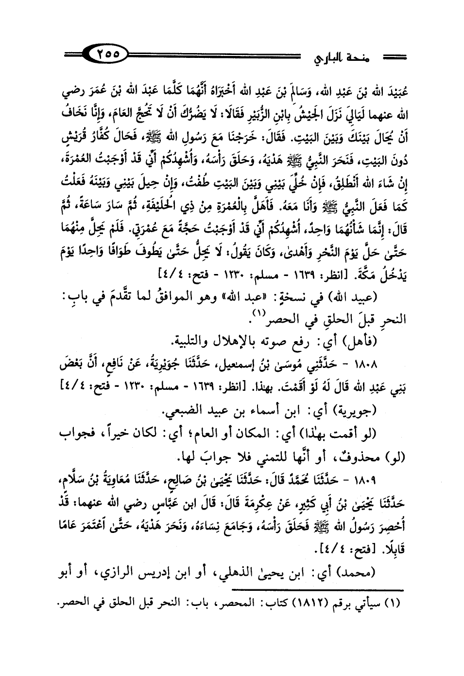 (عبيد الله) في نسخةٍ: "عبد الله" وهو الموافقُ لما تقدَّمَ في بابِ: النحرِ قبلَ الحلقِ في الحصر (¬1).