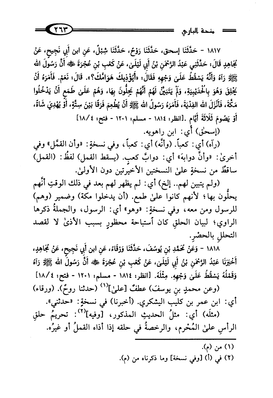 1817 - حَدَّثَنَا إِسْحَاقُ، حَدَّثَنَا رَوْحٌ، حَدَّثَنَا شِبْلٌ، عَنِ ابْنِ أَبِي نَجِيحٍ، عَنْ مُجَاهِدٍ، قَال: حَدَّثَنِي عَبْدُ الرَّحْمَنِ بْنُ أَبِي لَيْلَى، عَنْ كَعْبِ بْنِ عُجْرَةَ رَضِيَ اللَّهُ عَنْهُ، أَنَّ رَسُولَ اللَّهِ صَلَّى اللهُ عَلَيْهِ وَسَلَّمَ رَآهُ وَأَنَّهُ يَسْقُطُ عَلَى وَجْهِهِ، فَقَال: "أَيُؤْذِيكَ هَوَامُّكَ؟ "، قَال: نَعَمْ، فَأَمَرَهُ أَنْ يَحْلِقَ وَهُوَ بِالحُدَيْبِيَةِ، وَلَمْ يَتَبَيَّنْ لَهُمْ أَنَّهُمْ يَحِلُّونَ بِهَا وَهُمْ عَلَى طَمَعٍ أَنْ يَدْخُلُوا مَكَّةَ، فَأَنْزَلَ اللَّهُ الفِدْيَةَ، فَأَمَرَهُ رَسُولُ اللَّهِ صَلَّى اللهُ عَلَيْهِ وَسَلَّمَ أَنْ يُطْعِمَ فَرَقًا بَيْنَ سِتَّةٍ، أَوْ يُهْدِيَ شَاةً، أَوْ يَصُومَ ثَلاثَةَ أَيَّامٍ.