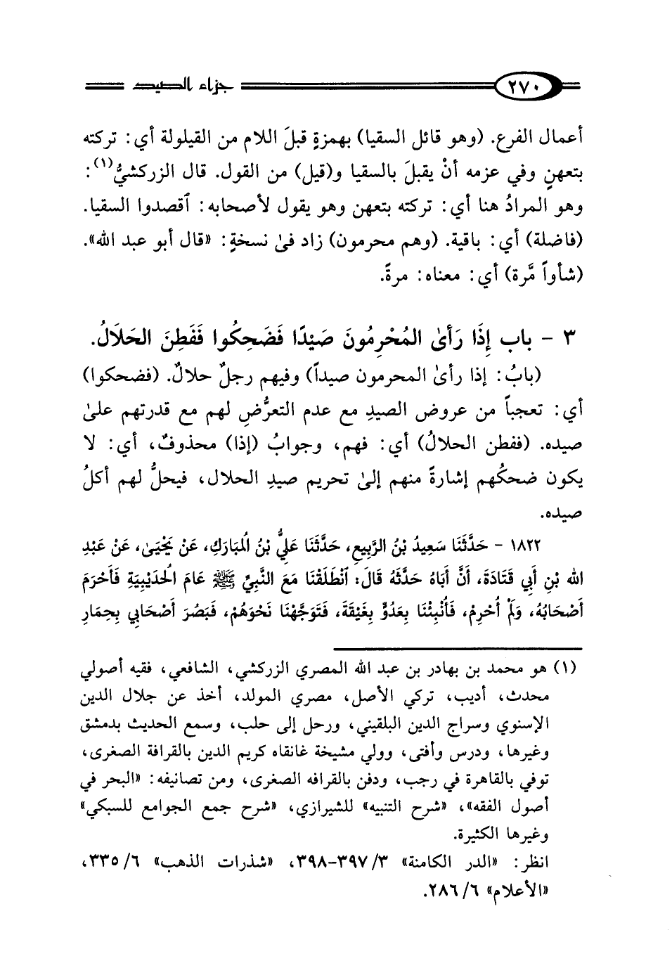 (¬1) هو محمد بن بهادر بن عبد الله المصري الزركشي، الشافعي، فقيه أصولي محدث، أديب، تركي الأصل، مصري المولد، أخذ عن جلال الدين الإسنوي وسراج الدين البلقيني، ورحل إلى حلب، وسمع الحديث بدمشق وغيرها، ودرس وأفتى، وولي مشيخة غانقاه كريم الدين بالقرافة الصغرى، توفي بالقاهرة في رجب، ودفن بالقرافه الصغرى، ومن تصانيفه: "البحر في أصول الفقه"، "شرح التنبيه" للشيرازي، "شرح جمع الجوامع للسبكي" وغيرها الكثيرة.