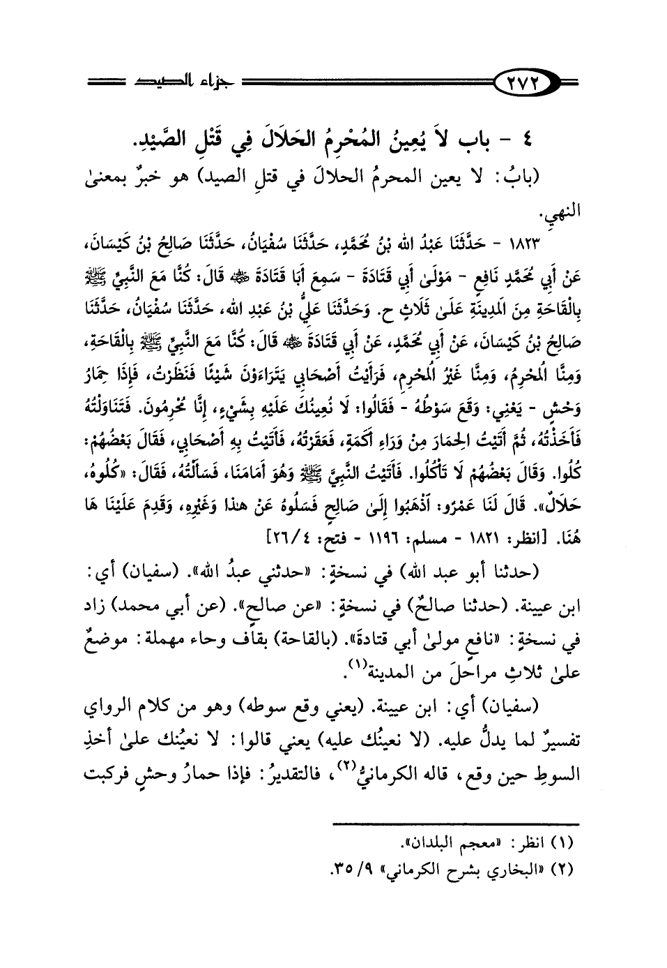 1823 - حَدَّثَنَا عَبْدُ اللَّهِ بْنُ مُحَمَّدٍ، حَدَّثَنَا سُفْيَانُ، حَدَّثَنَا صَالِحُ بْنُ كَيْسَانَ، عَنْ أَبِي مُحَمَّدٍ نَافِعٍ، مَوْلَى أَبِي قَتَادَةَ، سَمِعَ أَبَا قَتَادَةَ رَضِيَ اللَّهُ عَنْهُ، قَال: كُنَّا مَعَ النَّبِيِّ صَلَّى اللهُ عَلَيْهِ وَسَلَّمَ بِالقَاحَةِ مِنَ المَدِينَةِ عَلَى ثَلاثٍ ح وحَدَّثَنَا عَلِيُّ بْنُ عَبْدِ اللَّهِ، حَدَّثَنَا سُفْيَانُ، حَدَّثَنَا صَالِحُ بْنُ كَيْسَانَ، عَنْ أَبِي مُحَمَّدٍ، عَنْ أَبِي قَتَادَةَ رَضِيَ اللَّهُ عَنْهُ، قَال: كُنَّا مَعَ النَّبِيِّ صَلَّى اللهُ عَلَيْهِ وَسَلَّمَ بِالقَاحَةِ، وَمِنَّا المُحْرِمُ، وَمِنَّا غَيْرُ المُحْرِمِ، فَرَأَيْتُ أَصْحَابِي يَتَرَاءَوْنَ شَيْئًا، فَنَظَرْتُ، فَإِذَا حِمَارُ وَحْشٍ يَعْنِي وَقَعَ سَوْطُهُ، فَقَالُوا: لَا نُعِينُكَ عَلَيْهِ بِشَيْءٍ، إِنَّا مُحْرِمُونَ، فَتَنَاوَلْتُهُ، فَأَخَذْتُهُ ثُمَّ أَتَيْتُ الحِمَارَ مِنْ وَرَاءِ أَكَمَةٍ، فَعَقَرْتُهُ، فَأَتَيْتُ بِهِ أَصْحَابِي، فَقَال بَعْضُهُمْ: كُلُوا، وَقَال بَعْضُهُمْ: لَا تَأْكُلُوا، فَأَتَيْتُ النَّبِيَّ صَلَّى اللهُ عَلَيْهِ وَسَلَّمَ وَهُوَ أَمَامَنَا، فَسَأَلْتُهُ، فَقَال: "كُلُوهُ، حَلالٌ"، قَال لَنَا عَمْرٌو، اذْهَبُوا إِلَى صَالِحٍ فَسَلُوهُ عَنْ هَذَا وَغَيْرِهِ، وَقَدِمَ عَلَيْنَا هَا.