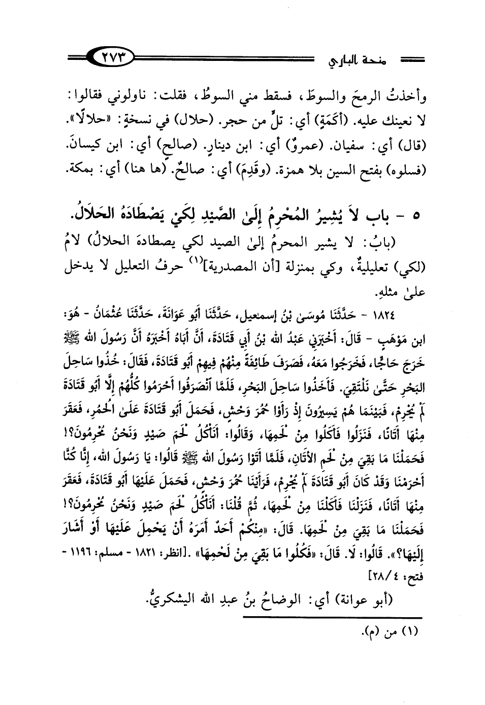 وأخذتُ الرمحَ والسوطَ، فسقط مني السوطُ، فقلت: ناولوني فقالوا: لا نعينك عليه. (أكَمَةٍ) أي: تلٍّ من حجر. (حلال) في نسخةٍ: "حلالًا". (قال) أي: سفيان. (عمروٌ) أي: ابن دينارٍ. (صالحٍ) أي: ابن كيسانَ. (فسلوه) بفتح السين بلا همزة. (وقَدِمَ) أي: صالحٌ. (ها هنا) أي: بمكة.