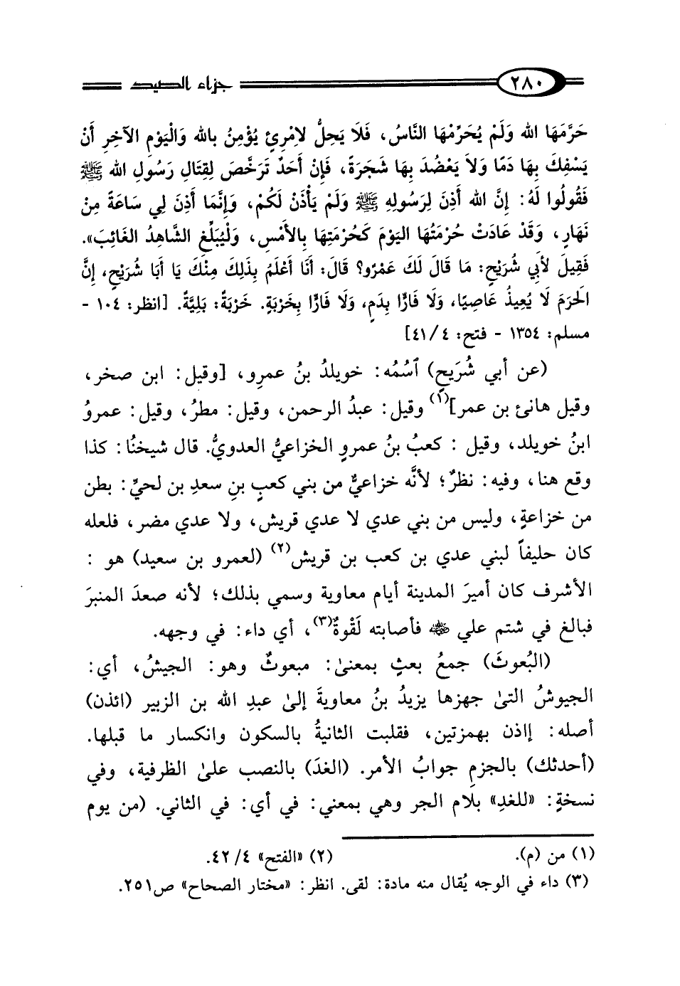 (عن أبي شُرَيحٍ) اسُمُه: خويلدُ بنُ عمرِو، [وقيل: ابن صخر، وقيل هانئ بن عمر] (¬1) وقيل: عبدُ الرحمن، وقيل: مطرُ، وقيل: عمروُ بنُ خويلد، وقيل: كعبُ بنُ عمرو الخزاعيُّ العدويُّ. قال شيخنُا: كذا وقع هنا، وفيه: نظرٌ؛ لأنَّه خزاعيٌّ من بني كعبِ بنِ سعدِ بن لحيٍّ: بطن من خزاعةٍ، وليس من بني عدي لا عدي قريش، ولا عدي مضر، فلعله كان حليفًا لبني عدي بن كعب بن قريش (¬2) (لعمرو بن سعيد) هو: الأشرف كان أميرَ المدينة أيام معاوية وسمي بذلك؛ لأنه صعدَ المنبرَ فبالغ في شتم علي - صلى الله عليه وسلم - أصابته لَقْوةٌ (¬3)، أي داء: في وجهه.