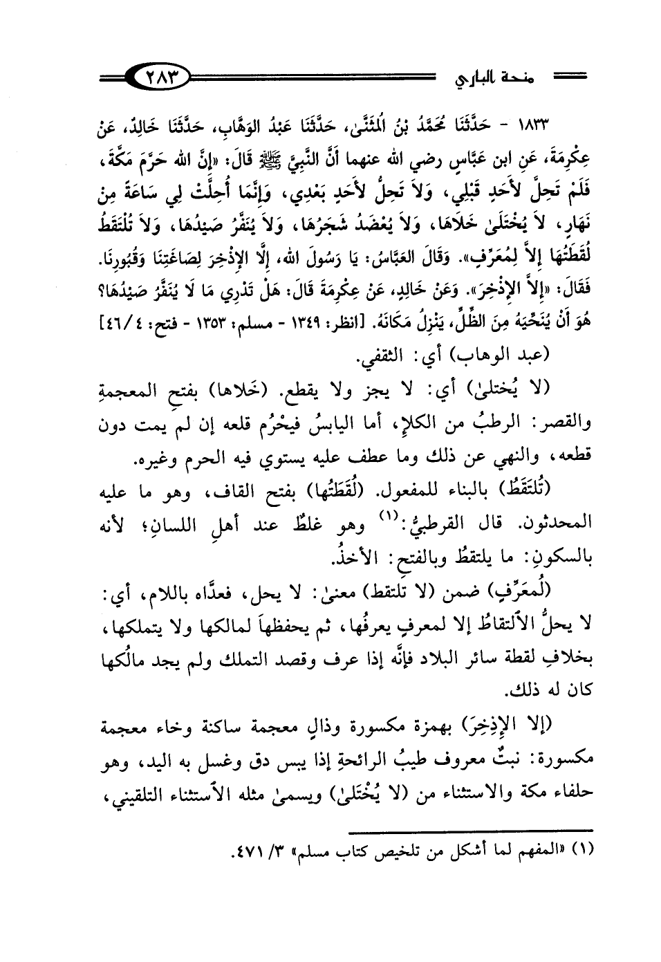 1833 - حَدَّثَنَا مُحَمَّدُ بْنُ المُثَنَّى، حَدَّثَنَا عَبْدُ الوَهَّابِ، حَدَّثَنَا خَالِدٌ، عَنْ عِكْرِمَةَ، عَنِ ابْنِ عَبَّاسٍ رَضِيَ اللَّهُ عَنْهُمَا، أَنَّ النَّبِيَّ صَلَّى اللهُ عَلَيْهِ وَسَلَّمَ قَال: "إِنَّ اللَّهَ حَرَّمَ مَكَّةَ، فَلَمْ تَحِلَّ لِأَحَدٍ قَبْلِي، وَلَا تَحِلُّ لِأَحَدٍ بَعْدِي، وَإِنَّمَا أُحِلَّتْ لِي سَاعَةً مِنْ نَهَارٍ، لَا يُخْتَلَى خَلاهَا، وَلَا يُعْضَدُ شَجَرُهَا، وَلَا يُنَفَّرُ صَيْدُهَا، وَلَا تُلْتَقَطُ لُقَطَتُهَا، إلا لِمُعَرِّفٍ"، وَقَال العَبَّاسُ: يَا رَسُولَ اللَّهِ، إلا الإِذْخِرَ، لِصَاغَتِنَا وَقُبُورِنَا؟ فَقَال: "إلا الإِذْخِرَ"، وَعَنْ خَالِدٍ، عَنْ عِكْرِمَةَ، قَال: هَلْ تَدْرِي مَا لَا يُنَفَّرُ صَيْدُهَا؟ هُوَ أَنْ يُنَحِّيَهُ مِنَ الظِّلِّ يَنْزِلُ مَكَانَهُ.