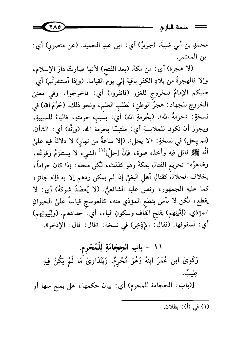 (لا هجرة) أي: من مكةَ. (بعد الفتحِ) لأنها صارتْ دارَ الإسلام، وإلا فالهجرةُ من بلادِ الكفرِ باقية إلي يوم القيامة. (وإذا استنفرتُم) أي: طلبكم الإمامُ للخروجِ للغزو (فانفروا) أي: فاخرجوا، وفي معنى الخروج للجهاد: هجرُ الوطنِ، لطلبِ العلمِ، ونحو ذلك. (حَرَّمَ الله) في نسخةٍ: "حرمة الله". (بحُرمةِ الله) أي: بسببِ حرمتهِ، فالباءُ للسببيةِ، ويجوز أن تكون للملابسةِ أي: ملتبسًا بحرمة الله. (وإنَّه) أي: الشأن. (لم يِحل) في نسخةٍ: "لا يحل". (إلا ساعةً من نهارِ) لا دلالةَ فيه على أنَّه - صلى الله عليه وسلم - قاتل فيه وأخذه عنوة، فإنَّ [حلَّ] (¬1) الشيء لا يستلزمُ وقوعُه، وظاهرُه: تحريمِ القتال بمكةَ وهو كذلك، لكن محله: إذا كان حرامًا، بخلاف الحلال كقتالِ أهلِ البغيِّ إذا لم يمكن ردهم إلا به فإنه جائز، كما عليه الجمهور، ونص عليه الشافعيُّ. (لا يُعضَدُ شوكهُ) أي: لا يقطع، لكن لا بأس بقطعِ المؤذي منه، كالعوسجِ قياسًا على الحيوانِ المؤذي. (لِقَينِهم) بفتحِ القاف وسكونِ الياء، أي: حدادهم. (ولبُيوتِهم) أي: لسقوفها. (فقال: الإِذِخِر) في نسخة: "قال: قال: الإذخر".