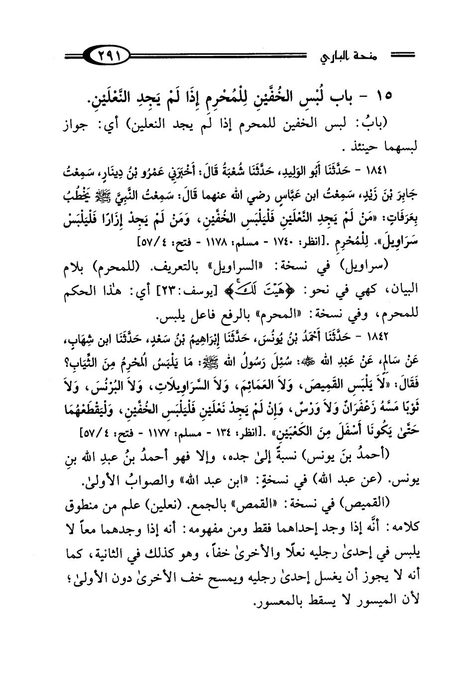 1842 - حَدَّثَنَا أَحْمَدُ بْنُ يُونُسَ، حَدَّثَنَا إِبْرَاهِيمُ بْنُ سَعْدٍ، حَدَّثَنَا ابْنُ شِهَابٍ، عَنْ سَالِمٍ، عَنْ عَبْدِ اللَّهِ رَضِيَ اللَّهُ عَنْهُ، سُئِلَ رَسُولُ اللَّهِ صَلَّى اللهُ عَلَيْهِ وَسَلَّمَ، مَا يَلْبَسُ المُحْرِمُ مِنَ الثِّيَابِ؟ فَقَال: "لَا يَلْبَسِ القَمِيصَ، وَلَا العَمَائِمَ، وَلَا السَّرَاويلاتِ، وَلَا البُرْنُسَ، وَلَا ثَوْبًا مَسَّهُ زَعْفَرَانٌ، وَلَا وَرْسٌ، وَإِنْ لَمْ يَجِدْ نَعْلَيْنِ فَلْيَلْبَسِ الخُفَّيْنِ وَلْيَقْطَعْهُمَا حَتَّى يَكُونَا أَسْفَلَ مِنَ الكَعْبَيْنِ".