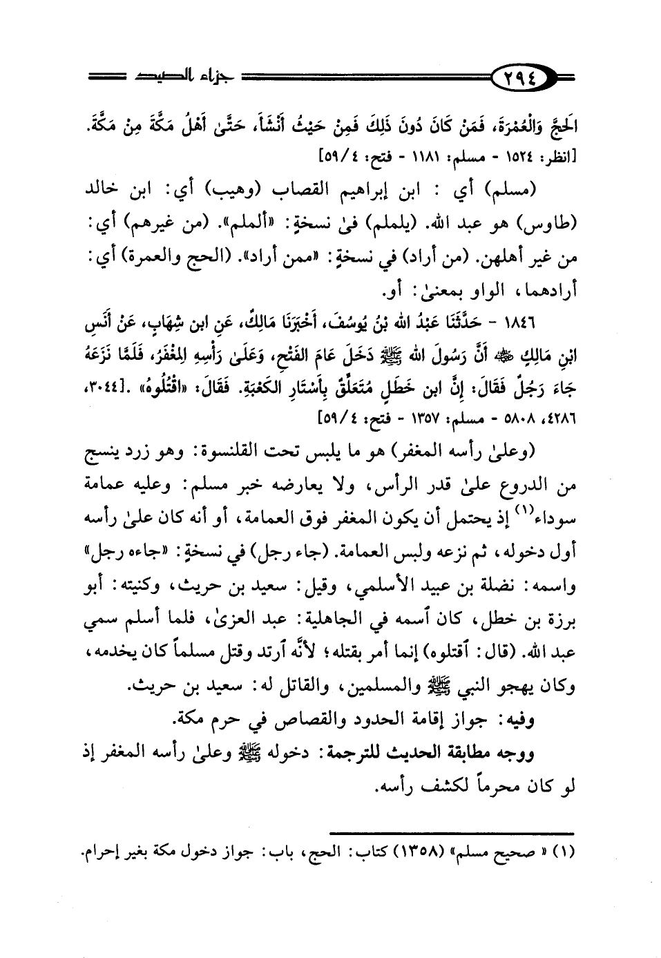 1846 - حَدَّثَنَا عَبْدُ اللَّهِ بْنُ يُوسُفَ، أَخْبَرَنَا مَالِكٌ، عَنِ ابْنِ شِهَابٍ، عَنْ أَنَسِ بْنِ مَالِكٍ رَضِيَ اللَّهُ عَنْهُ، أَنَّ رَسُولَ اللَّهِ صَلَّى اللهُ عَلَيْهِ وَسَلَّمَ، دَخَلَ عَامَ الفَتْحِ، وَعَلَى رَأْسِهِ المِغْفَرُ، فَلَمَّا نَزَعَهُ جَاءَ رَجُلٌ فَقَال: إِنَّ ابْنَ خَطَلٍ مُتَعَلِّقٌ بِأَسْتَارِ الكَعْبَةِ فَقَال "اقْتُلُوهُ".