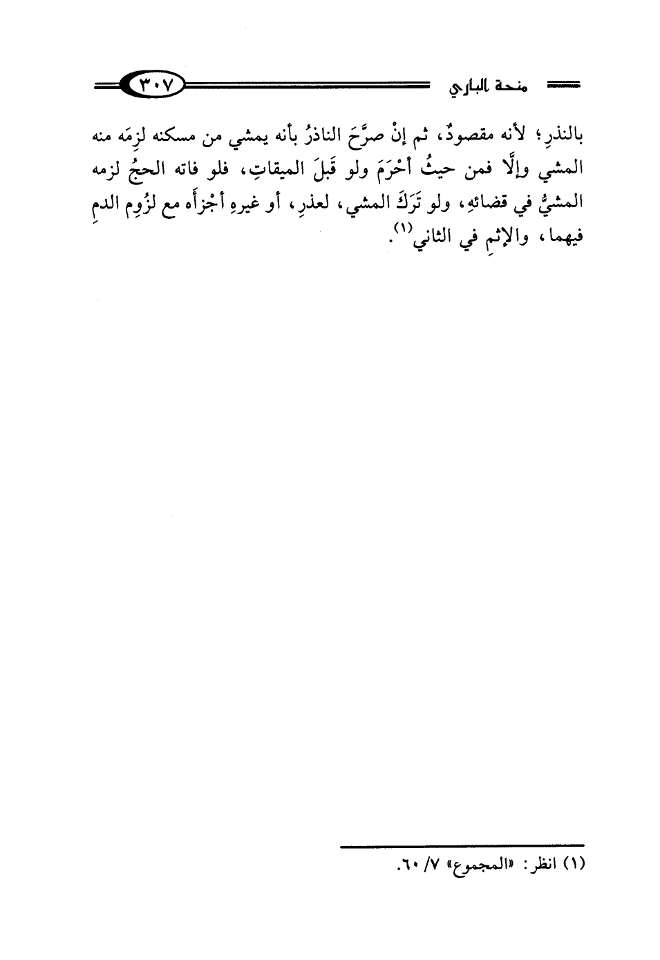 بالنذرِ؛ لأنه مقصودٌ، ثم إنْ صرَّحَ الناذرُ بأنه يمشي من مسكنه لزِمَه منه المشي وإِلَّا فمن حيثُ أحْرَمَ ولو قَبلَ الميقاتِ، فلو فاته الحجُّ لزمه المشي في قضائهِ، ولو تَرَكَ المشي، لعذرٍ، أو غيرهِ أجْزأَه مع لزُوم الدمِ فيهما، والإثمِ في الثاني (¬1).