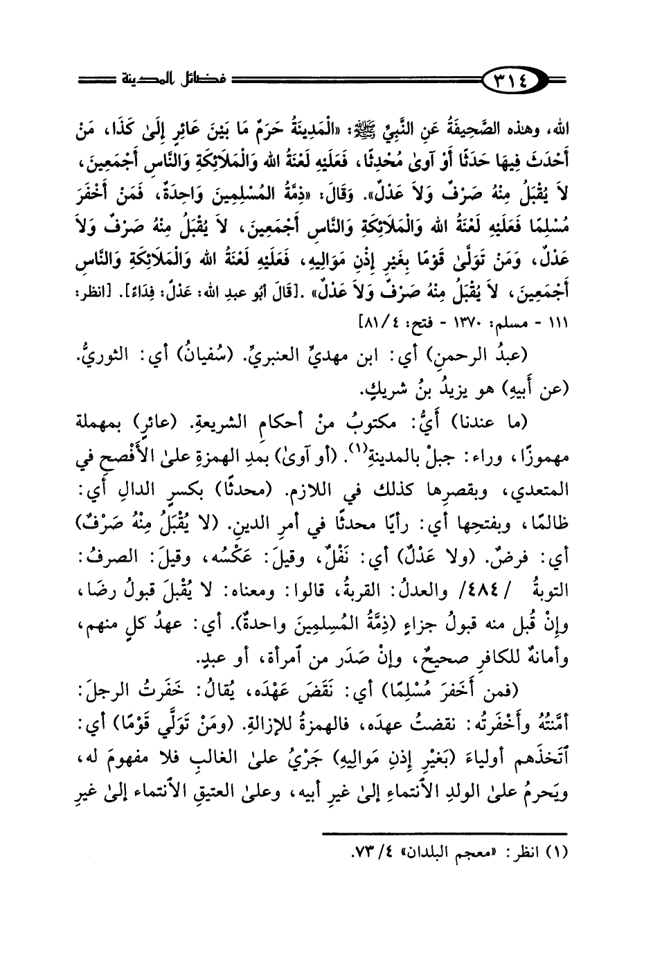 اللَّهِ، وَهَذِهِ الصَّحِيفَةُ عَنِ النَّبِيِّ صَلَّى اللهُ عَلَيْهِ وَسَلَّمَ: "المَدِينَةُ حَرَمٌ، مَا بَيْنَ عَائِرٍ إِلَى كَذَا، مَنْ أَحْدَثَ فِيهَا حَدَثًا، أَوْ آوَى مُحْدِثًا، فَعَلَيْهِ لَعْنَةُ اللَّهِ وَالمَلائِكَةِ وَالنَّاسِ أَجْمَعِينَ، لَا يُقْبَلُ مِنْهُ صَرْفٌ وَلَا عَدْلٌ، وَقَال: ذِمَّةُ المُسْلِمِينَ وَاحِدَةٌ، فَمَنْ أَخْفَرَ مُسْلِمًا فَعَلَيْهِ لَعْنَةُ اللَّهِ وَالمَلائِكَةِ وَالنَّاسِ أَجْمَعِينَ، لَا يُقْبَلُ مِنْهُ صَرْفٌ، وَلَا عَدْلٌ، وَمَنْ تَوَلَّى قَوْمًا بِغَيْرِ إِذْنِ مَوَالِيهِ، فَعَلَيْهِ لَعْنَةُ اللَّهِ وَالمَلائِكَةِ وَالنَّاسِ أَجْمَعِينَ، لَا يُقْبَلُ مِنْهُ صَرْفٌ، وَلَا عَدْلٌ".