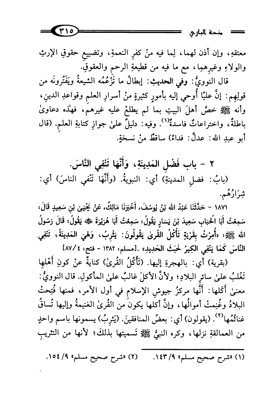قال النوويُّ: وفي الحديثِ: إبطالُ ما تَزْعُمُه الشيعةُ وَيفَتُرونَه من قولِهِم: إنَّ عليًّا أوحي إليه بأمورٍ كثيرةٍ منْ أسرارِ العلمِ وقواعدِ الدينِ، وأنه - صلى الله عليه وسلم - خصَّ أهلَ البيتِ بما لم يطلعْ عليه غيرهم، فهذه دعاوى باطلةٌ، واختراعاتٌ فاسدةٌ (¬1). وفيه: دليل على جوازِ كتابةِ العلمِ. (قال أبو عبد الله: عدلٌ: فداءٌ) ساقطٌ منْ نسخةٍ.