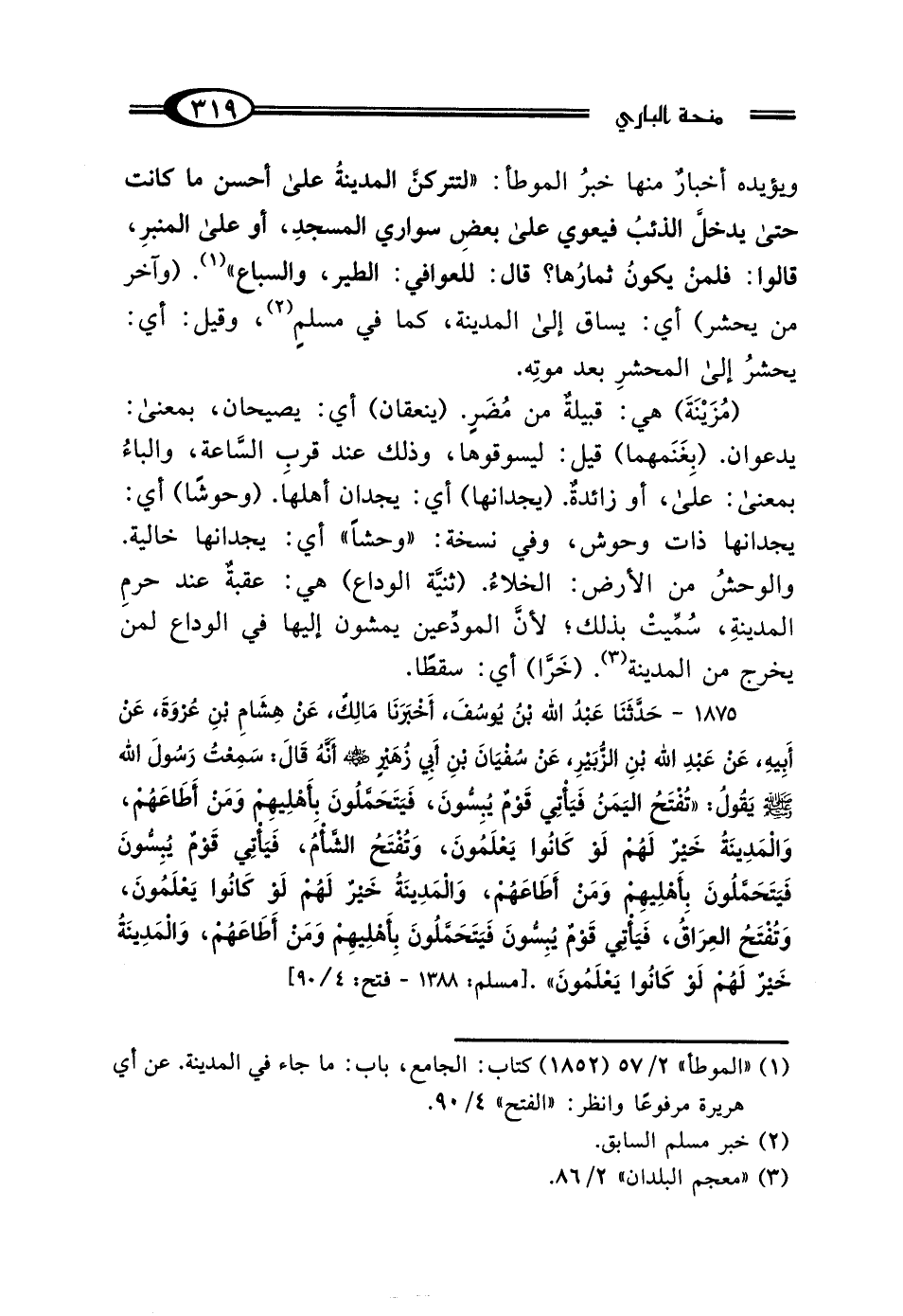 ويؤيده أخبارٌ منها خبرُ الموطأ: "لتتركنَّ المدينةُ على أحسن ما كانت حتى يدخل الذئبُ فيعوي على بعضِ سواري المسجدِ، أو على المنبرِ، قالوا: فلمنْ يكونُ ثمارُها؟ قال: للعوافي: الطير، والسباع" (¬1). (وآخر من يحشر) أي: يساق إلى المدينة، كما في مسلمٍ (¬2)، وقيل: أي: يحشرُ إلى المحشرِ بعد موتِه.