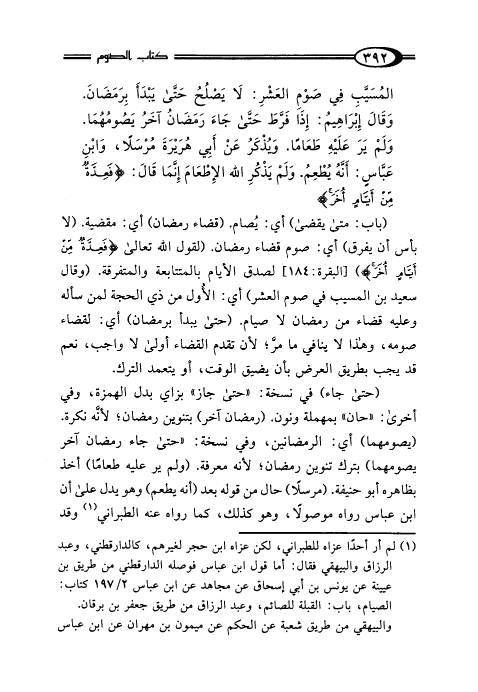 (حتى جاء) في نسخة: "حتى جاز" بزاي بدل الهمزة، وفي أخرى: "حان" بمهملة ونون. (رمضان آخر) بتنوين رمضان؛ لأنَّه نكرة. (يصومهما) أي: الرمضانين، وفي نسخة: "حتى جاء رمضان آخر يصومهما) بترك تنوين رمضان؛ لأنه معرفة. (ولم ير عليه طعامًا) أخذ بظاهره أبو حنيفة. (مرسلًا) حال من قوله بعد (أنه يطعم) وهو يدل على أن ابن عباس رواه موصولًا، وهو كذلك، كما رواه عنه الطبراني (¬1) وقد