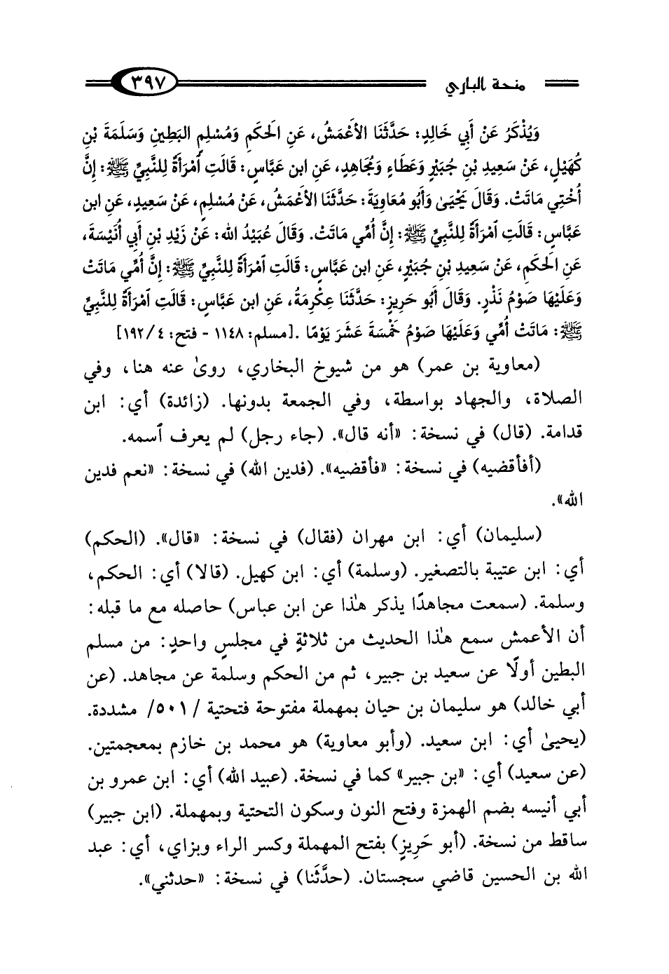 وَيُذْكَرُ عَنْ أَبِي خَالِدٍ، حَدَّثَنَا الأَعْمَشُ، عَنِ الحَكَمِ، وَمُسْلِمٍ البَطِينِ، وَسَلَمَةَ بْنِ كُهَيْلٍ، عَنْ سَعِيدِ بْنِ جُبَيْرٍ، وَعَطَاءٍ، وَمُجَاهِدٍ، عَنْ ابْنِ عَبَّاسٍ: قَالتِ امْرَأَةٌ لِلنَّبِيِّ صَلَّى اللهُ عَلَيْهِ وَسَلَّمَ: إِنَّ أُخْتِي مَاتَتْ، وَقَال يَحْيَى، وَأَبُو مُعَاويَةَ: حَدَّثَنَا الأَعْمَشُ، عَنْ مُسْلِمٍ، عَنْ سَعِيدِ بْنِ جُبَيْرٍ، عَنْ ابْنِ عَبَّاسٍ: قَالتِ امْرَأَةٌ لِلنَّبِيِّ صَلَّى اللهُ عَلَيْهِ وَسَلَّمَ: إِنَّ أُمِّي مَاتَتْ، وَقَال عُبَيْدُ اللَّهِ: عَنْ زَيْدِ بْنِ أَبِي أُنَيْسَةَ، عَنِ الحَكَمِ، عَنْ سَعِيدِ بْنِ جُبَيْرٍ، عَنْ ابْنِ عَبَّاسٍ: قَالتِ امْرَأَةٌ لِلنَّبِيِّ صَلَّى اللهُ عَلَيْهِ وَسَلَّمَ: إِنَّ أُمِّي مَاتَتْ وَعَلَيْهَا صَوْمُ نَذْرٍ، وَقَال أَبُو حَرِيزٍ، حَدَّثَنَا عِكْرِمَةُ، عَنْ ابْنِ عَبَّاسٍ: قَالتِ امْرَأَةٌ لِلنَّبِيِّ صَلَّى اللهُ عَلَيْهِ وَسَلَّمَ: مَاتَتْ أُمِّي وَعَلَيْهَا صَوْمُ خَمْسَةَ عَشَرَ يَوْمًا ..