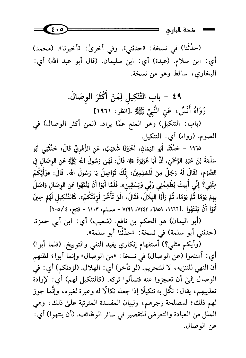 1965 - حَدَّثَنَا أَبُو اليَمَانِ، أَخْبَرَنَا شُعَيْبٌ، عَنِ الزُّهْرِيِّ، قَال: حَدَّثَنِي أَبُو سَلَمَةَ بْنُ عَبْدِ الرَّحْمَنِ، أَنَّ أَبَا هُرَيْرَةَ رَضِيَ اللَّهُ عَنْهُ، قَال: "نَهَى رَسُولُ اللَّهِ صَلَّى اللهُ عَلَيْهِ وَسَلَّمَ عَنِ الوصَالِ فِي الصَّوْمِ" فَقَال لَهُ رَجُلٌ مِنَ المُسْلِمِينَ: إِنَّكَ تُوَاصِلُ يَا رَسُولَ اللَّهِ، قَال: "وَأَيُّكُمْ مِثْلِي، إِنِّي أَبِيتُ يُطْعِمُنِي رَبِّي وَيَسْقِينِ"، فَلَمَّا أَبَوْا أَنْ يَنْتَهُوا عَنِ الوصَالِ، وَاصَلَ بِهِمْ يَوْمًا، ثُمَّ يَوْمًا، ثُمَّ رَأَوُا الْهِلَال، فَقَال: "لَوْ تَأَخَّرَ لَزِدْتُكُمْ" كَالتَّنْكِيلِ لَهُمْ حِينَ أَبَوْا أَنْ يَنْتَهُوا.
