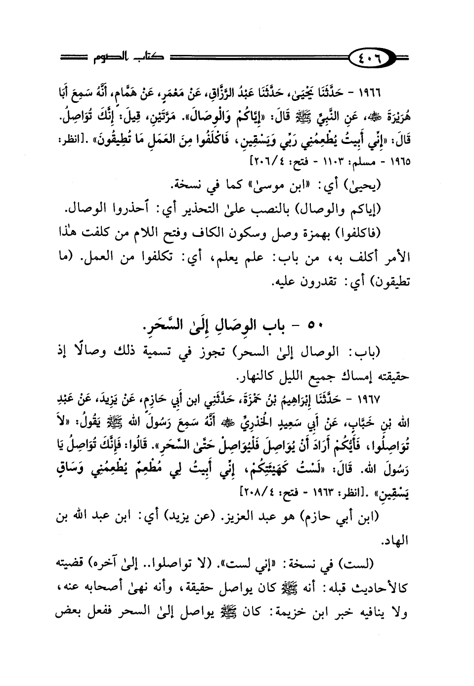 1967 - حَدَّثَنَا إِبْرَاهِيمُ بْنُ حَمْزَةَ، حَدَّثَنِي ابْنُ أَبِي حَازِمٍ، عَنْ يَزِيدَ، عَنْ عَبْدِ اللَّهِ بْنِ خَبَّابٍ، عَنْ أَبِي سَعِيدٍ الخُدْرِيِّ رَضِيَ اللَّهُ عَنْهُ، أَنَّهُ سَمِعَ رَسُولَ اللَّهِ صَلَّى اللهُ عَلَيْهِ وَسَلَّمَ، يَقُولُ: "لَا تُوَاصِلُوا، فَأَيُّكُمْ أَرَادَ أَنْ يُوَاصِلَ، فَلْيُوَاصِلْ حَتَّى السَّحَرِ"، قَالُوا: فَإِنَّكَ تُوَاصِلُ يَا رَسُولَ اللَّهِ، قَال: "لَسْتُ كَهَيْئَتِكُمْ إِنِّي أَبِيتُ لِي مُطْعِمٌ يُطْعِمُنِي، وَسَاقٍ يَسْقِينِ".