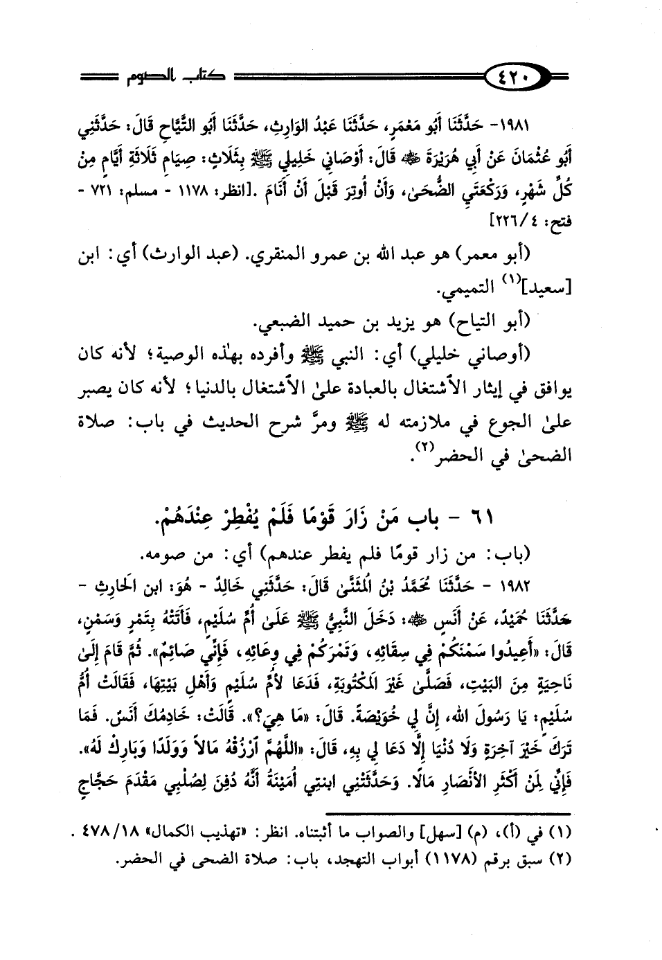 1981 - حَدَّثَنَا أَبُو مَعْمَرٍ، حَدَّثَنَا عَبْدُ الوَارِثِ، حَدَّثَنَا أَبُو التَّيَّاحِ، قَال: حَدَّثَنِي أَبُو عُثْمَانَ، عَنْ أَبِي هُرَيْرَةَ رَضِيَ اللَّهُ عَنْهُ، قَال: أَوْصَانِي خَلِيلِي صَلَّى اللهُ عَلَيْهِ وَسَلَّمَ بِثَلاثٍ: "صِيَامِ ثَلاثَةِ أَيَّامٍ مِنْ كُلِّ شَهْرٍ، وَرَكْعَتَيِ الضُّحَى، وَأَنْ أُوتِرَ قَبْلَ أَنْ أَنَامَ".