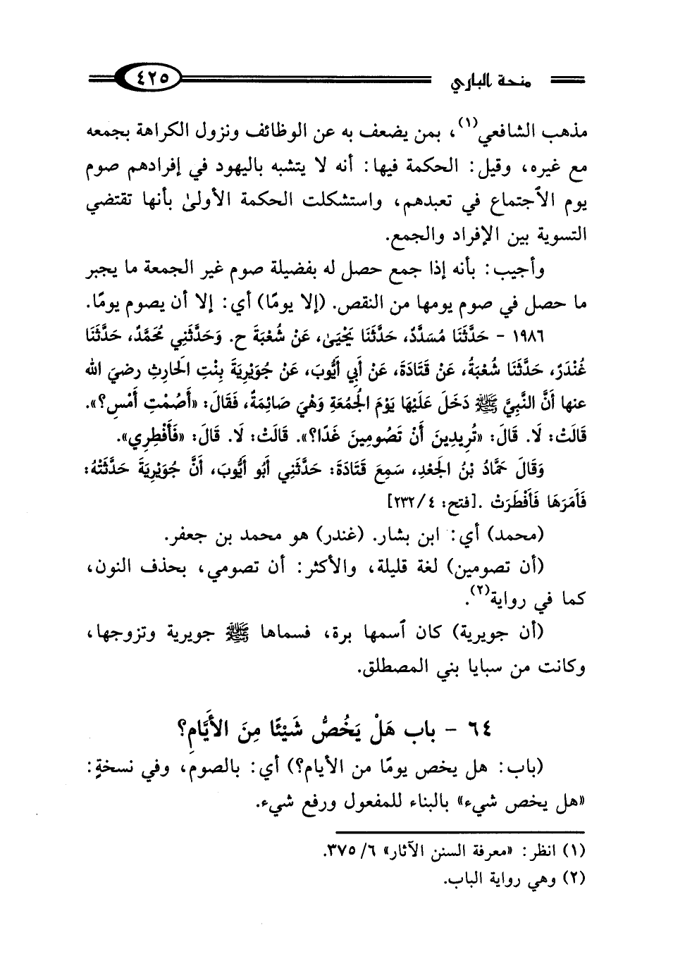 1986 - حَدَّثَنَا مُسَدَّدٌ، حَدَّثَنَا يَحْيَى، عَنْ شُعْبَةَ، ح وحَدَّثَنِي مُحَمَّدٌ، حَدَّثَنَا غُنْدَرٌ، حَدَّثَنَا شُعْبَةُ، عَنْ قَتَادَةَ، عَنْ أَبِي أَيُّوبَ، عَنْ جُوَيْرِيَةَ بِنْتِ الحَارِثِ رَضِيَ اللَّهُ عَنْهَا، أَنَّ النَّبِيَّ صَلَّى اللهُ عَلَيْهِ وَسَلَّمَ، دَخَلَ عَلَيْهَا يَوْمَ الجُمُعَةِ وَهِيَ صَائِمَةٌ، فَقَال: "أَصُمْتِ أَمْسِ؟ "، قَالتْ: لَا، قَال: "تُرِيدِينَ أَنْ تَصُومِي غَدًا؟ " قَالتْ: لَا، قَال: "فَأَفْطِرِي"، وَقَال حَمَّادُ بْنُ الجَعْدِ: سَمِعَ قَتَادَةَ، حَدَّثَنِي أَبُو أَيُّوبَ، أَنَّ جُوَيْرِيَةَ، حَدَّثَتْهُ: فَأَمَرَهَا فَأَفْطَرَتْ.
