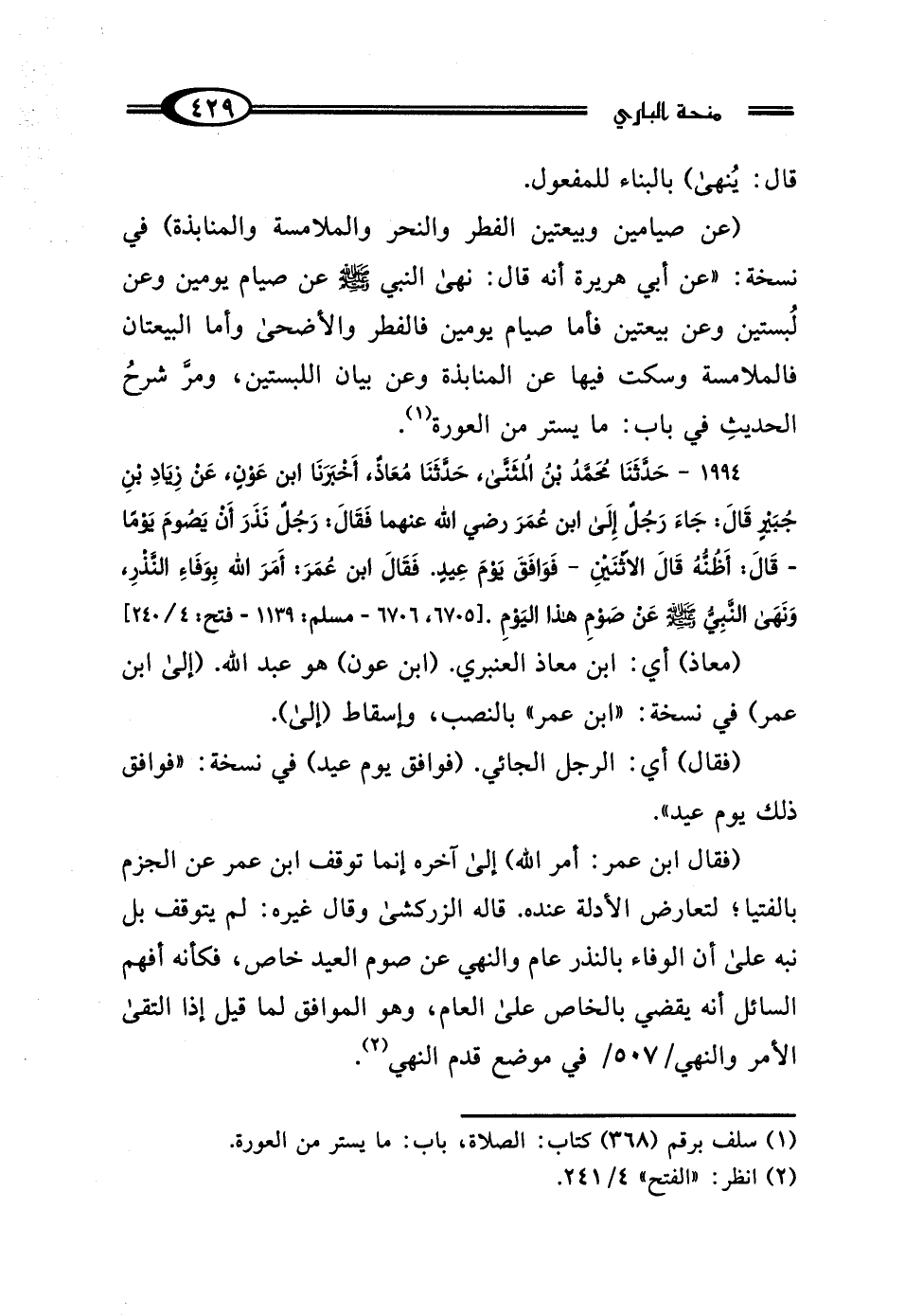 (عن صيامين وبيعتين الفطر والنحر والملامسة والمنابذة) في نسخة: "عن أبي هريرة أنه قال: نهى النبي - صلى الله عليه وسلم - عن صيام يومين وعن لُبستين وعن بيعتين فأما صيام يومين فالفطر والأضحى وأما البيعتان فالملامسة وسكت فيها عن المنابذة وعن بيان اللبستين، ومرَّ شرحُ الحديثِ في باب: ما يستر من العورة (¬1).