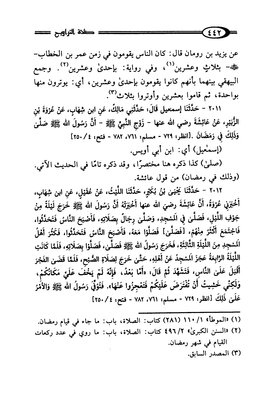 2011 - حَدَّثَنَا إِسْمَاعِيلُ، قَال: حَدَّثَنِي مَالِكٌ، عَنِ ابْنِ شِهَابٍ، عَنْ عُرْوَةَ بْنِ الزُّبَيْرِ، عَنْ عَائِشَةَ رَضِيَ اللَّهُ عَنْهَا - زَوْجِ النَّبِيِّ صَلَّى اللهُ عَلَيْهِ وَسَلَّمَ -: "أَنَّ رَسُولَ اللَّهِ صَلَّى اللهُ عَلَيْهِ وَسَلَّمَ صَلَّى وَذَلِكَ فِي رَمَضَانَ".