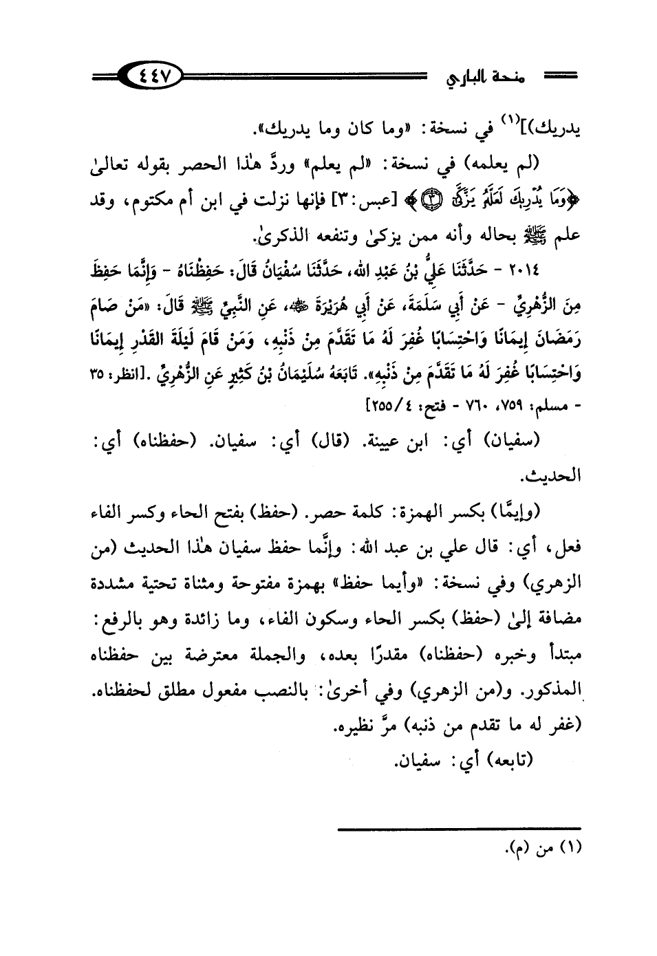 2014 - حَدَّثَنَا عَلِيُّ بْنُ عَبْدِ اللَّهِ، حَدَّثَنَا سُفْيَانُ، قَال: حَفِظْنَاهُ، وَإِنَّمَا حَفِظَ مِنَ الزُّهْرِيِّ، عَنْ أَبِي سَلَمَةَ، عَنْ أَبِي هُرَيْرَةَ رَضِيَ اللَّهُ عَنْهُ، عَنِ النَّبِيِّ صَلَّى اللهُ عَلَيْهِ وَسَلَّمَ، قَال: "مَنْ صَامَ رَمَضَانَ إِيمَانًا وَاحْتِسَابًا غُفِرَ لَهُ مَا تَقَدَّمَ مِنْ ذَنْبِهِ، وَمَنْ قَامَ لَيْلَةَ القَدْرِ إِيمَانًا وَاحْتِسَابًا غُفِرَ لَهُ مَا تَقَدَّمَ مِنْ ذَنْبِهِ"، تَابَعَهُ سُلَيْمَانُ بْنُ كَثِيرٍ، عَنِ الزُّهْرِيِّ.