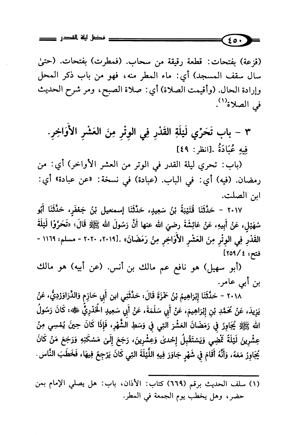 2017 - حَدَّثَنَا قُتَيْبَةُ بْنُ سَعِيدٍ، حَدَّثَنَا إِسْمَاعِيلُ بْنُ جَعْفَرٍ، حَدَّثَنَا أَبُو سُهَيْلٍ، عَنْ أَبِيهِ، عَنْ عَائِشَةَ رَضِيَ اللَّهُ عَنْهَا: أَنَّ رَسُولَ اللَّهِ صَلَّى اللهُ عَلَيْهِ وَسَلَّمَ، قَال: "تَحَرَّوْا لَيْلَةَ القَدْرِ فِي الوتْرِ، مِنَ العَشْرِ الأَوَاخِرِ مِنْ رَمَضَانَ".