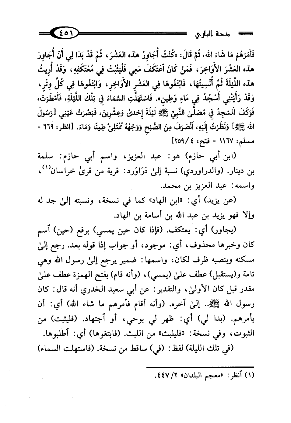 (يجاور) أي: يعتكف. (فإذا كان حين يمسي) برفع (حين) اسم كان وخبرها محذوف، أي: موجود، أو جواب إذا قوله بعد. رجع إلى مسكنه وبنصبه ظرف لكان، واسمها: ضمير يرجع إلى رسول الله وهي تامة و (يستقبل) عطف على (يمسي)، (وأنه قام) بفتح الهمزة عطف على مقدر قبل كان الأولى، والتقدير: عن أبي سعيد الخدري أنه قال: كان رسول الله - صلى الله عليه وسلم - .. إلى آخره. (وأنه أقام فأمرهم ما شاء الله) أي: أن يأمرهم. (بدا لي) أي: ظهر لي بوحي، أو اجتهاد. (فليثبت) من الثبوت، وفي نسخة: "فليلبث" من اللبث. (فابتغوها) أي: اطلبوها.